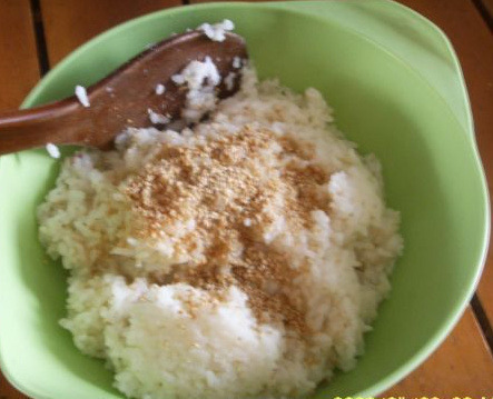▶ 곱슬하게 소금을 넣어 지은밥에 깨소금 참기름을 넣어 잘 비벼 줍니다