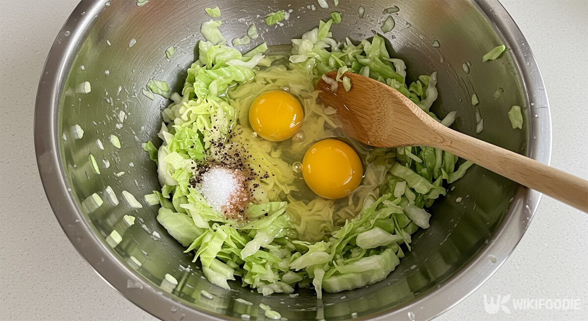 이후 양배추에 달걀 3개, 소금 1t, 후추를 넣고 섞는다.