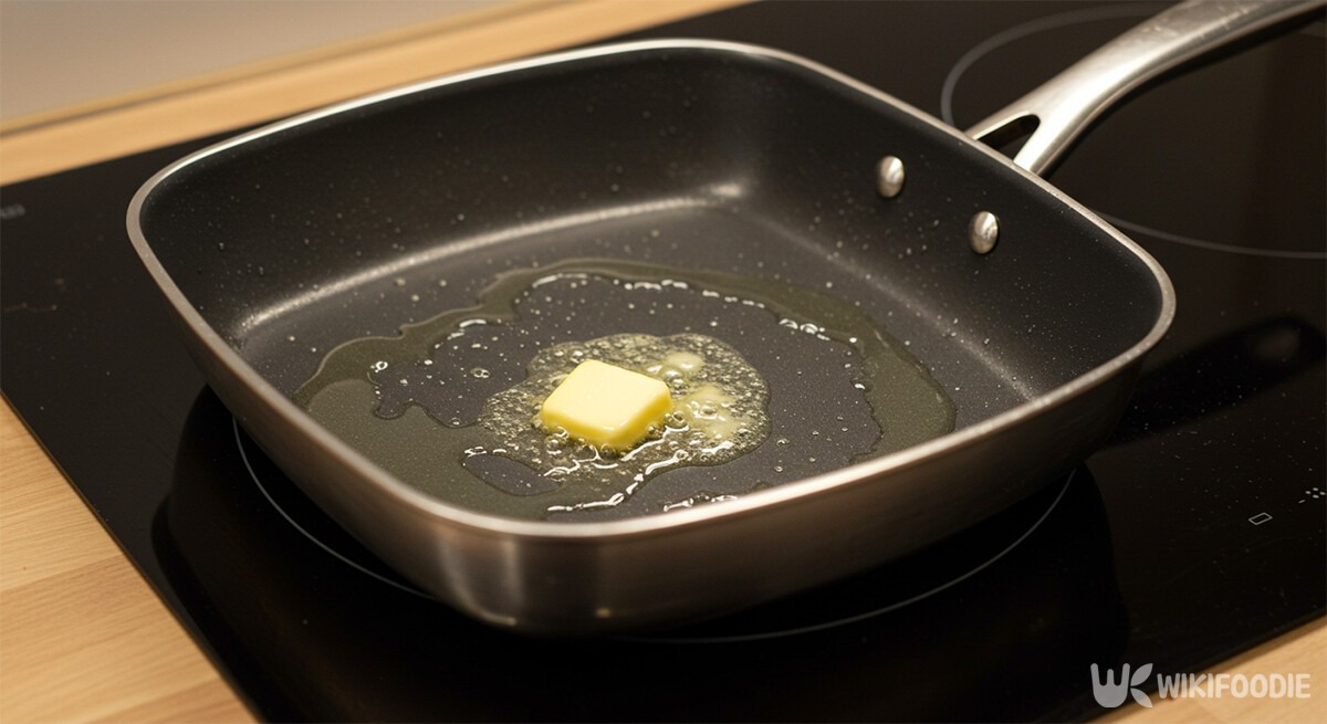 2. 사각팬에 식용유와 버터를 넣고 약불에서 녹인다.
