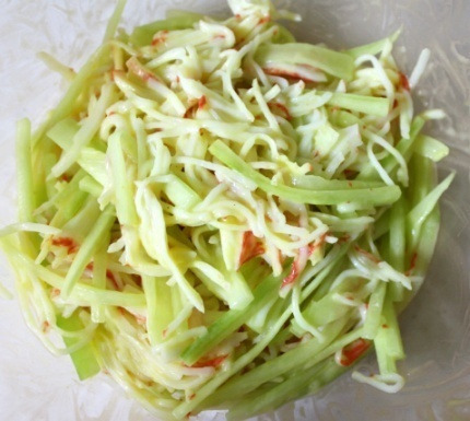 3) 채를 썬 오이와 찢은 크래미를 한 그릇에 담아줍니다.