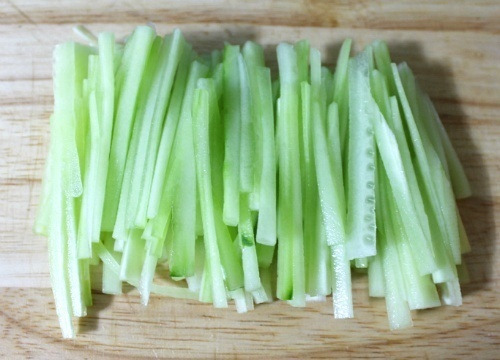 1) 오이는 껍질을 벗기고 씨 부분을 제거한 후 채를 썰어 준비합니다.