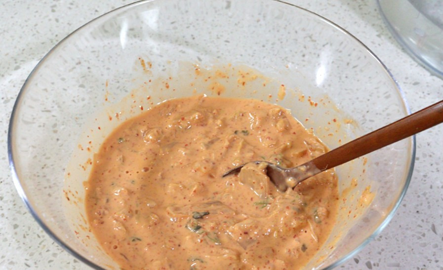 진간장 2큰술, 식초 1큰술, 설탕 반큰술, 고춧가루 반큰술, 다진마늘 반큰술 참기름, 깨소금조금