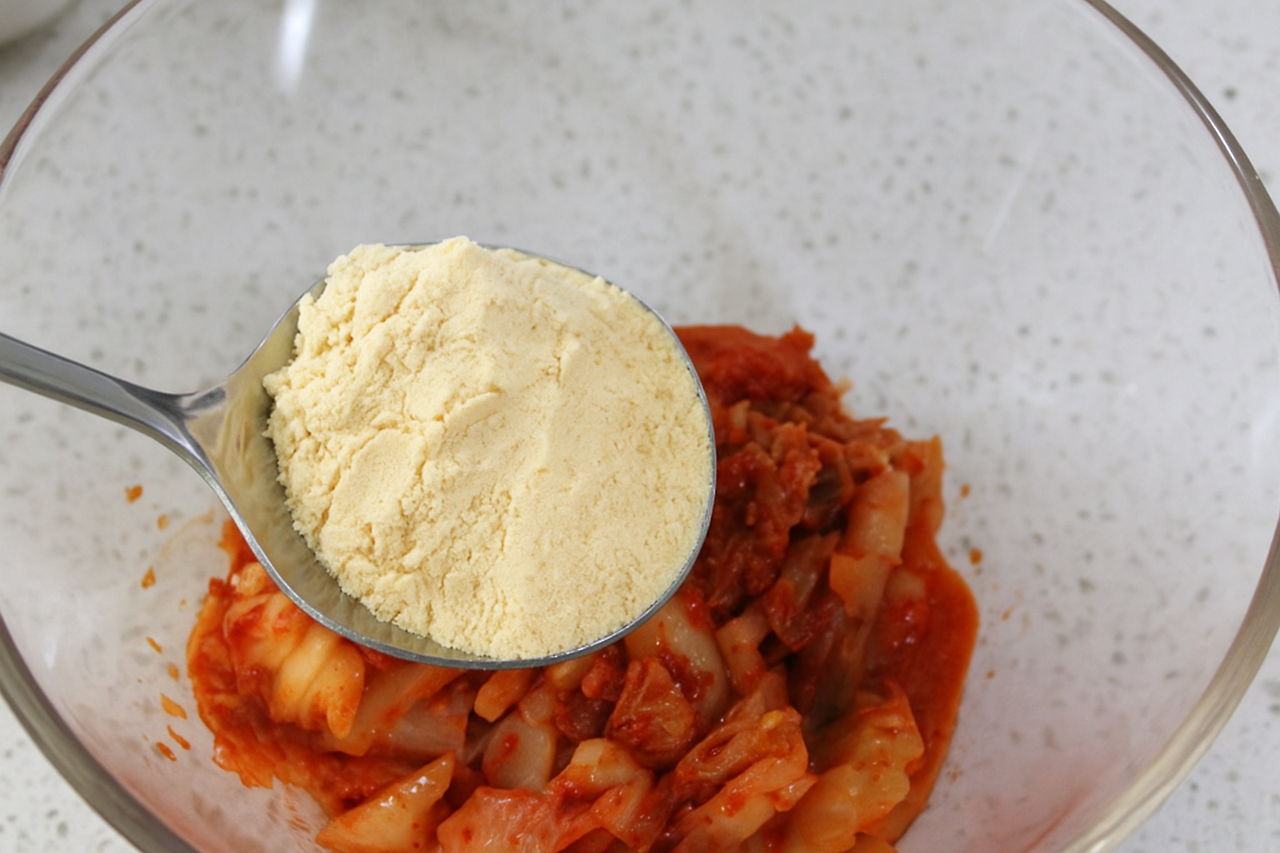 썰어놓은 김치에 병가리콩 가루와 물을 넣고 잘 섞어줍니다. 기호에 다라 고춧가루와 청양고추 들기름을 추가해주세요.