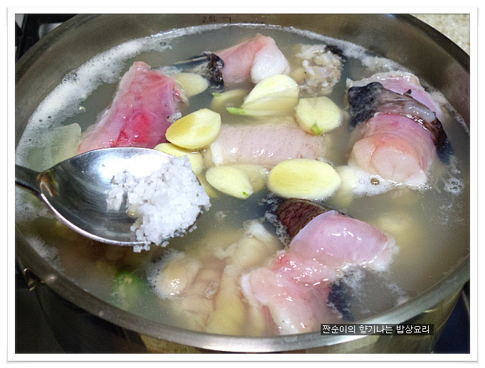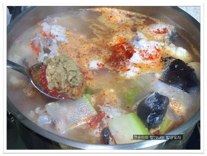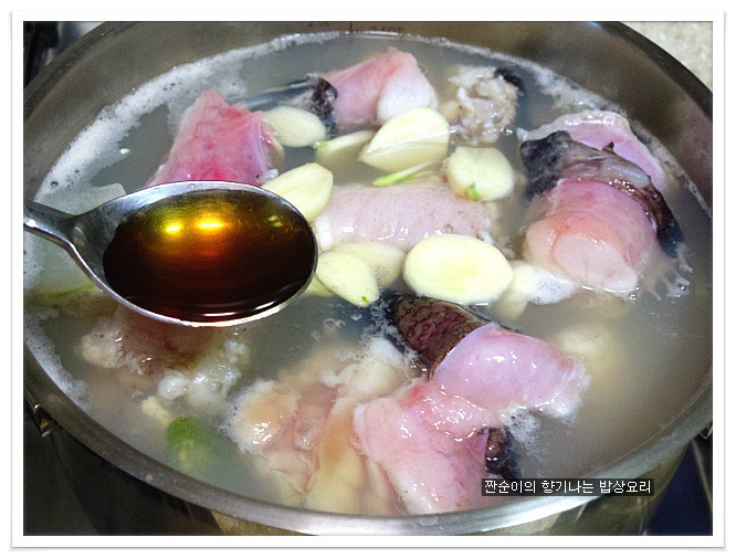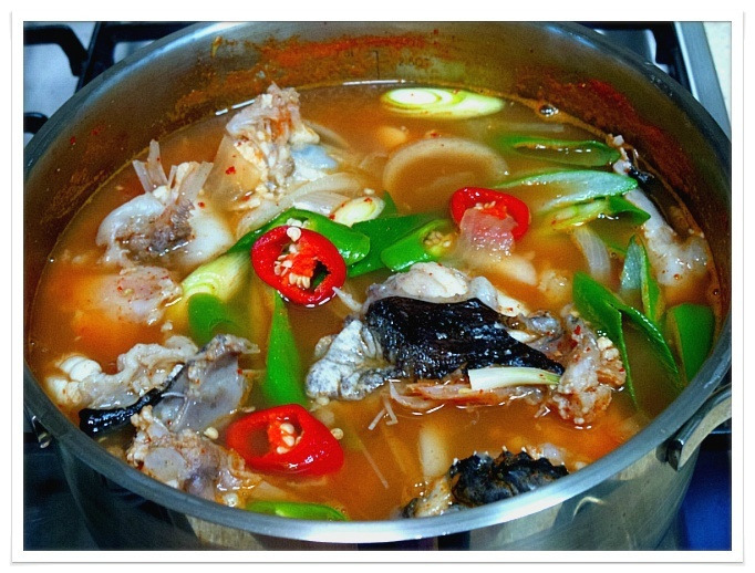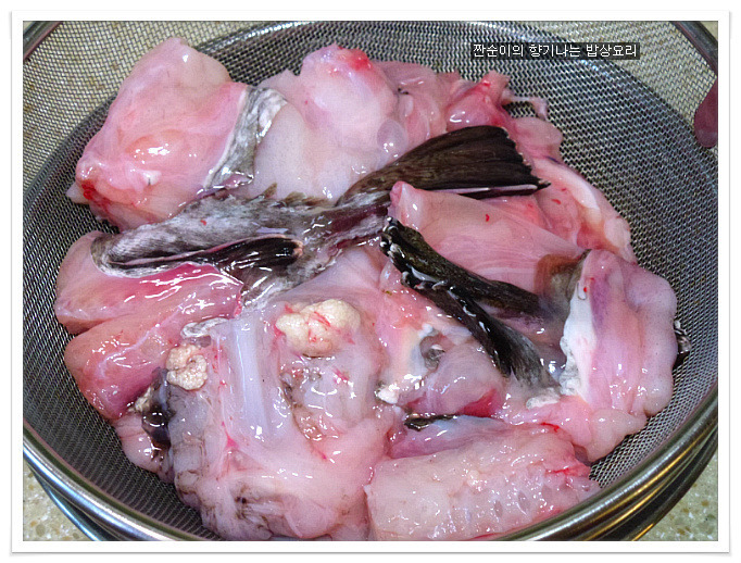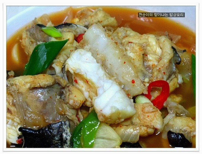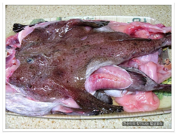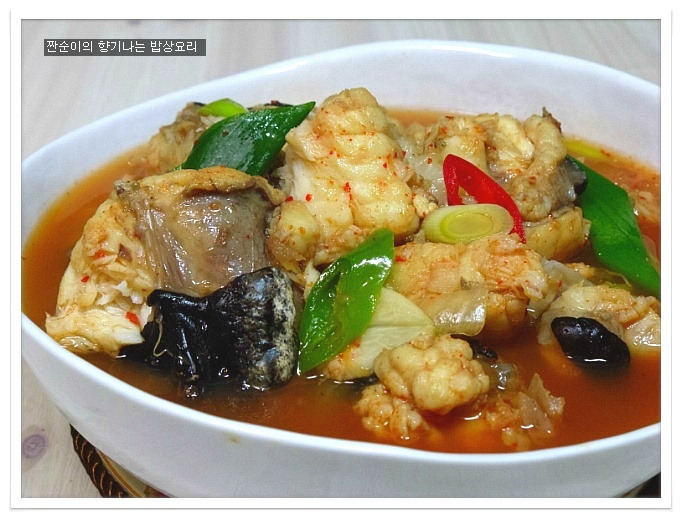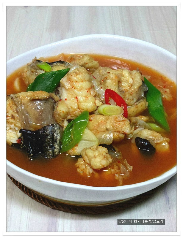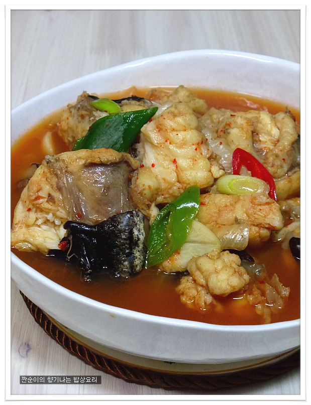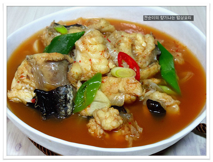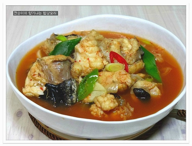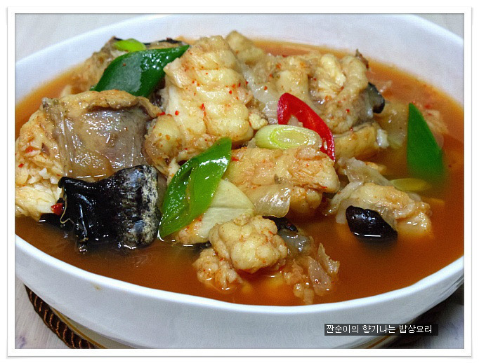 | 부드럽고 야들야들 시원한 아구탕 끓이는법 특별한 재료 들어가지 않아도 부드러운 살점이 참 맛있기도 하고 시원한국물맛이 참 좋아요 싱싱한 생물로 사가지고온 아구입니다 사진으로 보니 조금 그렇지요? 그래도 맛은 아주 좋은 생선이지요 예전에는 생선취급도 안했던 아구인데 요즘은 귀한몸값자랑하고 있는 녀석이네요 ㅎㅎ 아구는 입속에 필히 손질해야 하는 부분이 있어서 일부러 사진을 찍어 올렸어요 입속에 동그랗게 가시가 두군데가 있는데 생선집에서 손질해줄땐 이부분을 해주지 않아서 예전에 신랑이 아구탕 먹가다 목에 걸려서 혼났던적이 있던지라 꼭 이부분을 미리 가위로 잘라 손질해준답니다 살짝 말려서 하면 더 좋은데 오늘은신랑이 아구탕먹고 싶다해서 급한대로 바로 손질해서 요리할거예요 아주싱싱한 녀석이라 바로 끓여내면 시원하고 담백해서 좋아요~~ 재료:아구1마리반정도,멸치다시마육수9컵(종이컵),굵은소금1/4술,무,양파, 청양고추와 홍고추,대파,마늘3쪽,멸치액젓2큰술, 맛술2큰술,고추가루1큰술과 고추장1큰술 그리고 된장반큰술,후추 각각의 재료는 미리 손질해 준비해요 멸치다시마육수에 시원함을 더해줄 무를 얇게 나박썰어 넣어 끓여줍니다 그리고 칼칼함을 더해줄 청양고추는 조금만 넣어 끓여주어요 육수에 무의 시원함이 우러나와 끓으면 여기에 손질해둔 아구와 마늘을 넣어주고 먼저 굵은소금1/4큰술을 넣어주어 끓여주어요 소금간만으로는 맛을 내기보단 소금과 멸치액젓을 섞어서 간을 주는게 좋아요 멸치액젓은2큰술정도 넣어주었어요 아구가 들어가고 나면 중간중간 거품이 많이 생기니 생기는 거품은 수시로 걷어주구요 맛술도 2큰술정도 넣어주어요 여기에 고추가루1큰술과 고추장1큰술 그리고 된장반큰술을 넣어주어 끓여줍니다 매운탕이나 생선탕에 된장을 넣어주면 생선의 비린맛을 잡아주기도 하고 맛도 내주고 ~~ 마무리에 채썬양파와 홍고추 그리고 풋고추와 대파를 넣어주어 살짝 끓이고 후추로 마무리 하심 간단하게 끓여낸 아구탕이 완성됩니다 부드럽고 야들야들 시원하고 맛있느 아구탕 아구탕하면 웬지 모르게 복잡하게 느껴져서 잘 끓이지 않게 되지만 저처럼 그냥 쉽게 끓여도 시원하고 맛있어요 더군다나 오늘같은 날엔 딱이네요 ㅋ |