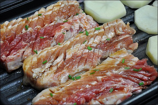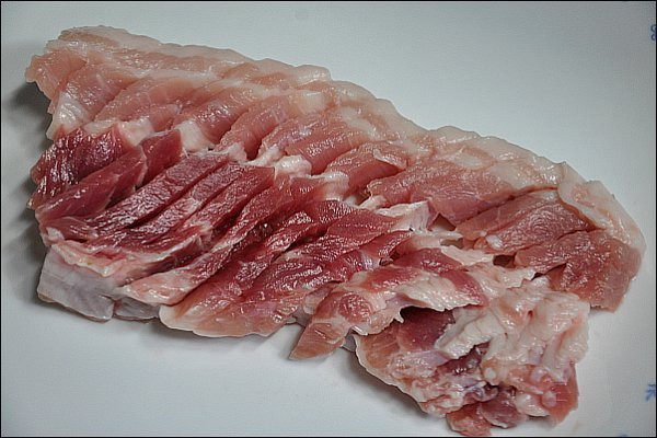 자른 삼겹살은 앞뒤로 어슷하게 칼집을 내어 주었답니다.(한쪽은 ////// 방향으로. 뒤집어 \\\\\)