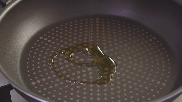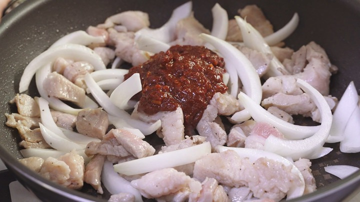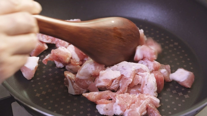 널찍한 팬에 중불에서 식용유와 돼지고기를 넣고 먼저 살짝 볶아 주세요.