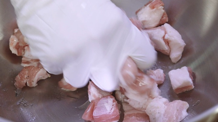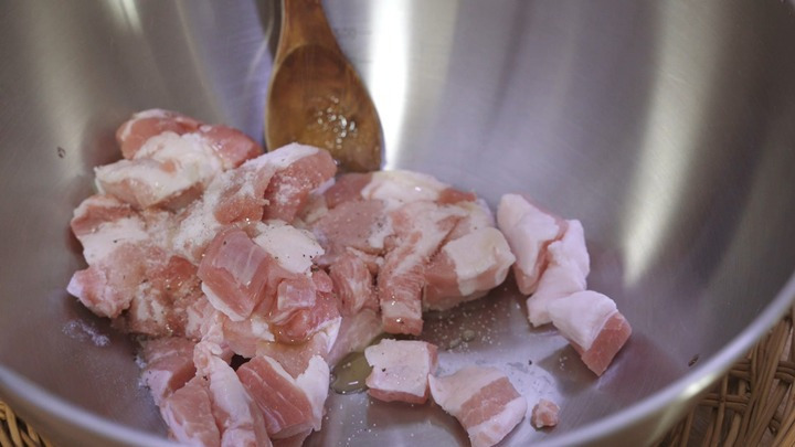 썰어 놓은 돼지고기에 후추, 생강청, 소금을 넣고 미리 밑간을 해 놓으세요.