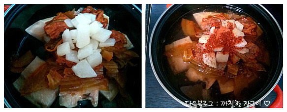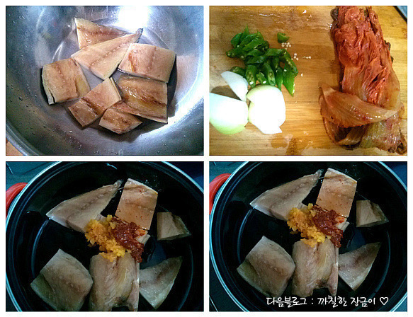 | 묵은지 5장,간고등어2마리(작은크기에요),양파 반개,청양고추 3개,간마늘 1큰술,된장 1작은술, 무조금,양파효소 1작은술,후추 톡톡 3번,고추가루 2큰술,묵은지 국물 2큰술 큰술: 밥수저 / 작은술: 티스푼보다 조금큼 / 컵: 종이컵 모든분들 입맛이 같지 않으므로...입맛에 맞게 조절하세요.. . 고등어를 먹기좋은 크기로 썰어서 소주에 10분간 담가두었어요!!! . 후추도 뿌려줍니다. . 나머지 재료 준비해둡니다. . 냄비에 고등어,된장,간마늘,묵은지,무 넣고 쌀뜰물있으심 그거넣고, . 없으심 그냥 물조금, 고추가루 넣고 졸입니다. . 15분가량 끓인후 양파와 청양고추 넣고 5분정도 더 끓이면 완성입니다. |