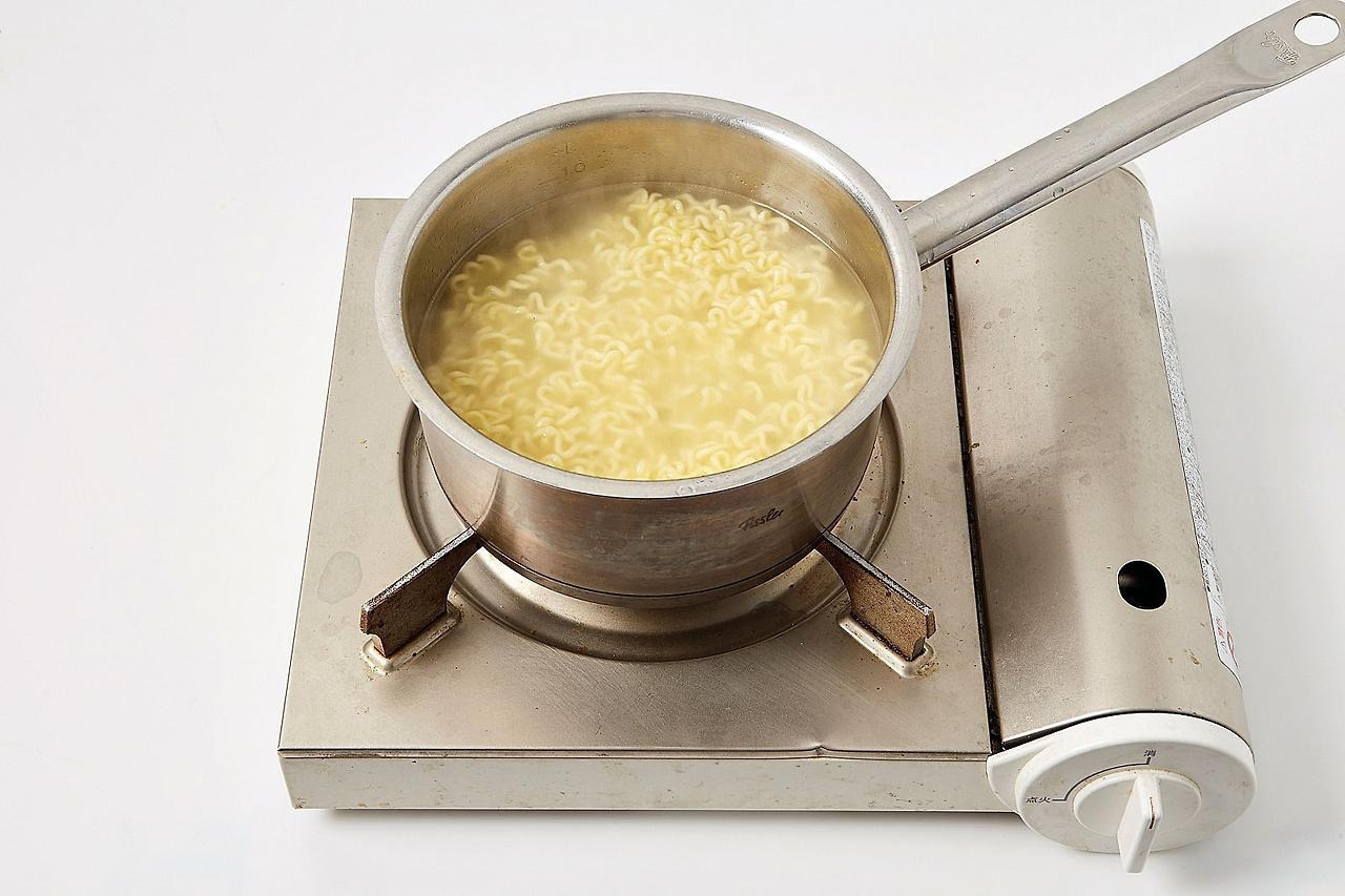 1. 끓는 물(3컵)에 라면을 넣어 4분간 삶고,