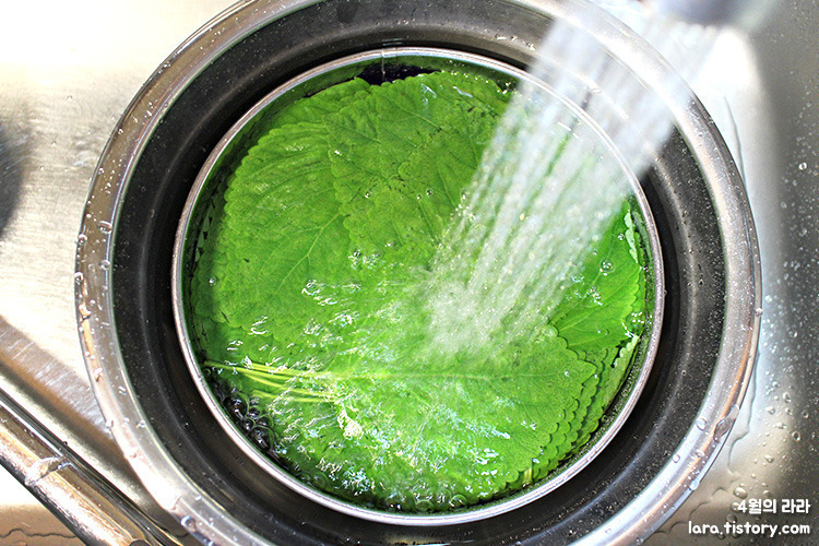이제 깻잎을 채반체로 찬물에 담가 헹궈 주고,