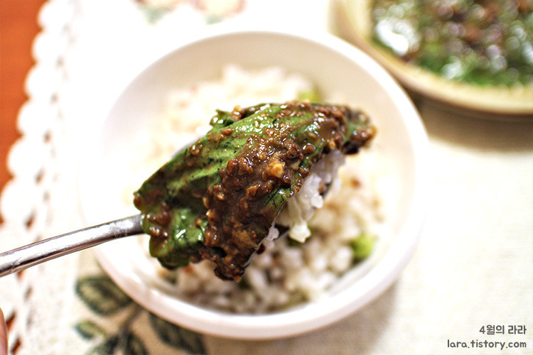 방금 지은 따뜻한 밥위에 깻잎 한 장씩 올려 먹으니 밥이 금방 사라져요.