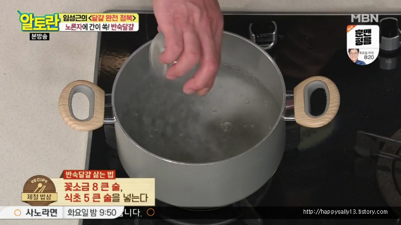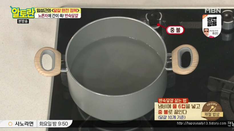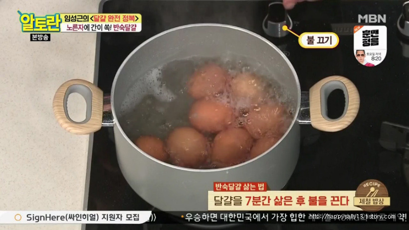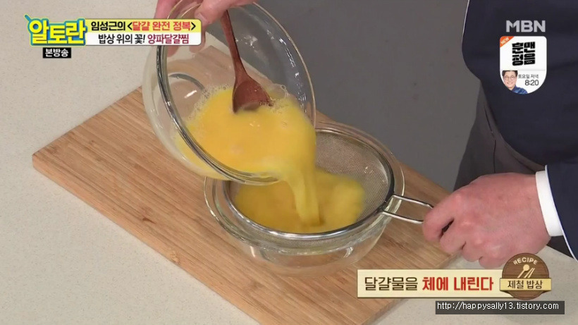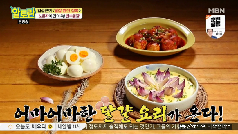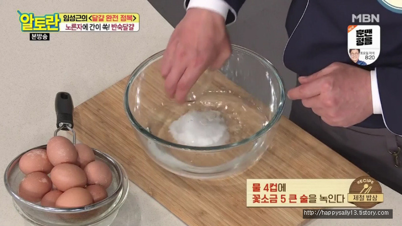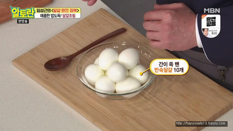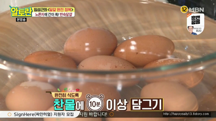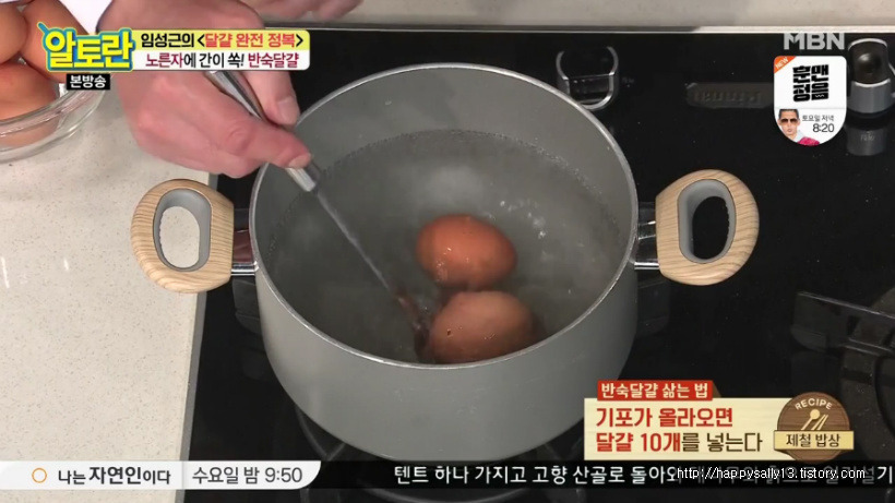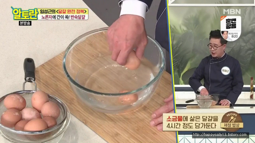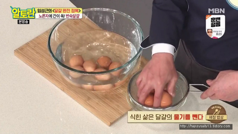 임성근의 달걀 요리 완전 정복입니다 반숙달걀 냉장고에서 금방 꺼내 달걀을 삶으면 온도차가 커서 쉽게 터집니다 달걀은 미리 꺼내 실온에 30분 정도 두거나 시간이 없다면 흐르는 물에 3~4분간 뒀다가 요리하세요 삶기 전에 달걀을 흔들어주면 노른자가 가운데로 가서 예쁘게 삶을 수 있어요 냄비에 물 6컵을 넣고 중불에 끓여서 기포가 올라오면 꽃소금 8큰술, 식초 5큰술 넣고 달걀 10개를 넣어주세요 중불에서 7분간 삶아주고 곧바로 찬물에 담가 10분 이상 식혀주세요 식힌 달걀은 꺼내 물기를 빼고 물 4컵에 꽃소금 5큰술 넣어 완전히 녹인다음 물기 제거한 달걀 넣어 최소 4시간 이상 담가두면 간이 쏙 밴 반숙달걀이 됩니다 소금물에 담가두고 하나씩 꺼내 먹어도 돼요 달걀조림 반숙달걀 10개 준비하세요 멸치육수 1컵, 고추장 2큰술, 고운 고추가루 3큰술, 진간장 4큰술, 설탕 2큰술, 물엿 3큰술, 후추 1작은술 넣어 끓여주세요 양념장이 끓으면 양파 1개, 청양고추 3개 넣어 졸여주세요 양념장이 반으로 줄어들면 반숙달걀 10개 넣어 2분간 졸여주세요 마지막으로 참기름 2큰술 넣고 불을 꺼주세요 |