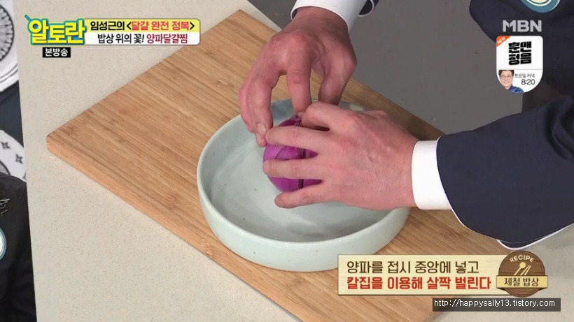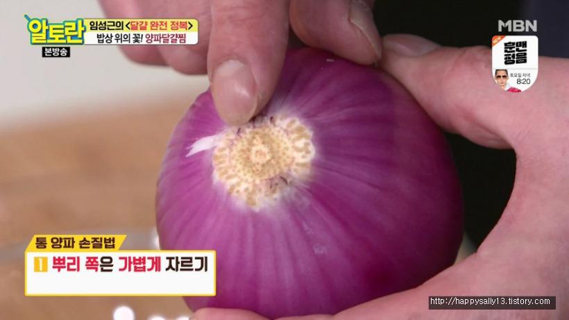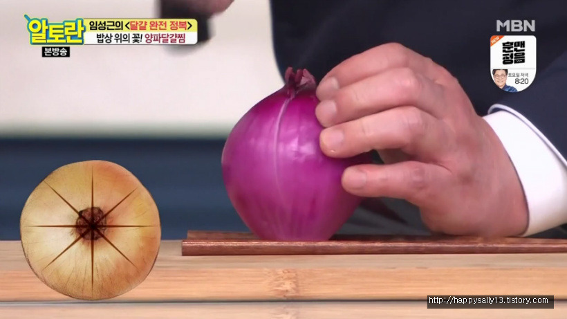 색감을 위해 적양파를 준비하는데 뿌리쪽은 가볍게 자르고