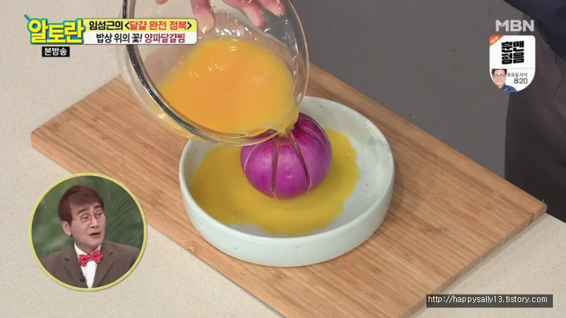 칼집을 살짝 벌린 다음 양파 가운데에 달걀물을 부어주세요