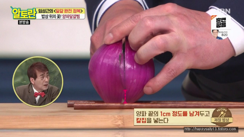 양파 앞뒤로 나무젓가락을 놓고 양파 끝의 1cm 정도를 남겨두고 칼집을 넣어주세요