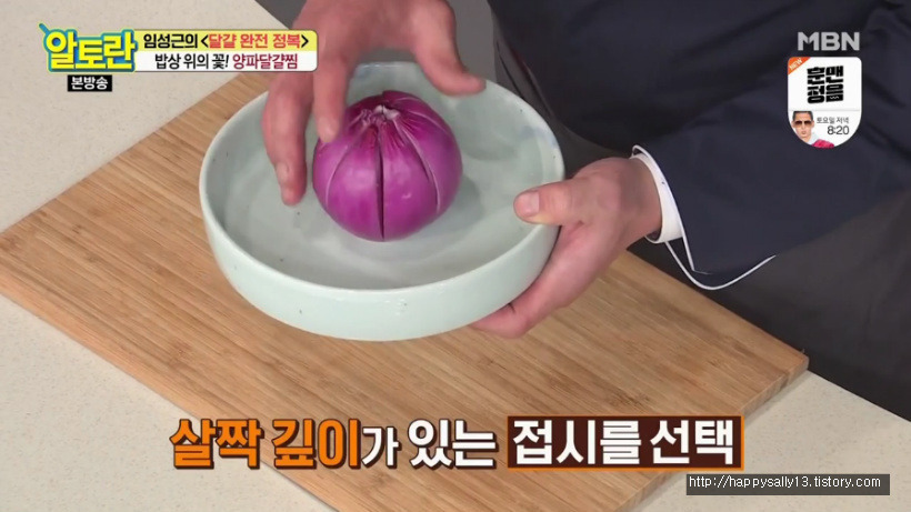 양파가 1/3 정도 잠기는 깊이의 접시에 양파를 중앙에 넣고