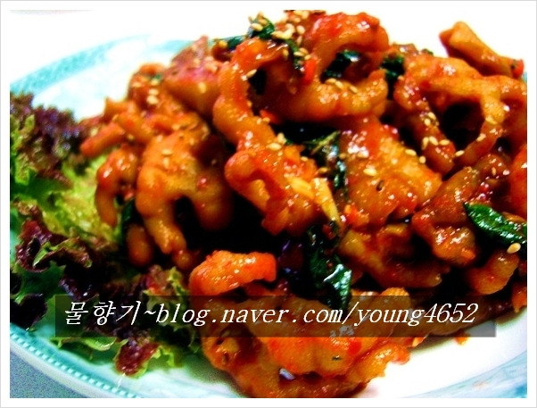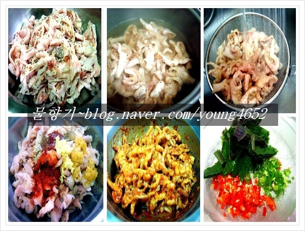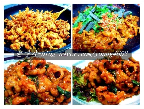 | 응근히 매콤함이 땡기는 요즈음.. 지금 저희집은 봄맞이 집단장으로 매주마다 한쪽한쪽 부분 인테리어 공사중이랍니다.. 열심히 옆지기가 일하구 있는데 ..전 옆에서 잔심부름만 하죠~ㅋㅌ 피로 확~날려주고 기분 업 기켜줄겸 준비 한 매운 불닭발~ 예전엔 닭발루 해 먹었는데..뼈 발라 먹는 재미두 쏠쏠은 하지만 안주로는 좋은데 밥이랑 먹을려니 별루.. 닭발로만 파는줄 알고 여태 닭발만 구입했는데...에거 시장에 가서 닭발 사믄서 아줌마 한티 물어보니 뼈 발라 파는 닭발두 있드라는..ㅡㅡ;; 왜 여태 있을거란 생각을 안 했는쥐.. 기뿐 마음에 조금 비싸지만 3팩 (\5000)구입.. 스트레스 확~날려줄 불 닭발 만들어 먹어봐욤~ 주재료-뼈없는 닭발 (3팩에 \5000) 부재료-깻잎10장.청/홍고추각2개. 닭발 재움-청주2T.허브솔트2T.통깨1T.포도씨유기름1T. 양념장-고추장3T.고추가루3T.진간장 2T.맛술1T.다진마늘2T.다진생강(가루)1t. 설탕 1t.요리당1T.매실엑기스1T.참기름1T.후추가루 1t. ㅃㅕ 없는 닭발 만들기~ 1.냉동된 뼈 없는 닭발을 찬물에 담구어 자연해동 시킨후 찬물에 씻어 건진 후 굵은 소금이랑 밀가루 1큰술을 넣어 고무장갑찌고 바락바락 문질러 여러번 씻어 물기를 밴 후 볼에 담아줍니다. ㅡ> 닭발에 미쳐 벗겨지지 않는 노란 껍질과 이물질을 제거한답니다.. 2.볼에 닭발을 담은 후 청주(맛술)2T.허브솔트2T 넣어 골고루 뒤적여 누린내 제거를 잠시 재워 줍니다. 3. 냄비에 적닥량에 물을 끓여 재워둔 닭발을 넣고 살짝 데친 후 흐르는 찬물에 채를 놓고 닭발이 꼬들 꼬들하게 한번 씻어 건져 물기를 빼 먹기 좋은 크기로 자른 후 다시 볼에 담아줍니다. 4.분량에 양념장 재료들을 넣어 2~30분 정도 양념장에 재워줍니다. ㅡ>고추장3T.고추가루3T.진간장 2T.맛술1T.다진마늘2T.다진생강(가루)1t.설탕 1t. 요리당1T.매실엑기스1T.참기름1T.후추가루 1t. 5.양념에 재워두는 동안 갯잎을 씻어 물기를 뺀 후 반으로 썰어 잘게 채 썰어 준비합니다. 청/홍고추두 반 가른 후 잘게 다져 준비합니다. 6.팬을 달구어 포도씨유 기름을 두르고 재워 둔 닭발을 넣어 센불에서 재빨리 볶아 주고 양념 한 볼에 물을 조금 넣어 양념을 희석한 걸 넣어 주면 닭발이 타지 않아요~ ㅡ>닭발을 데쳐 1차로 익혔으므로 오래동안 볶지 않아두 돼요~ 7.어느정도 볶아지면 중불로 낮추어 주고 준비한 깻잎이랑 청/홍고추 다진걸 넣어 살짝 익을 정도만 뒤적여 주고 통깨를 넣어 마무리합니다. 8.접시에 상추 깻잎을 깔고 완성된 뼈 없는 닭발을 푸짐히 올려주고 통깨를 뿌려 냅니다. 저희들은 밥이랑 쌈 싸 먹었어요~^^ 뼈없는 닭발이라 상추 쌈에 밥이랑 고추장 볶음장이랑 양파.마늘 저민것.청 고추 올려 한입 커다랗게 쌈으로.. 입안 가득 매콤함~ㅎ 뼈 발라서 먹는 것보다 씹는 질감두 더 좋구 푸짐히 먹는 느낌 팍팍~옵니다...^^ 거기어 겨들여 먹는 쏘쥬~한잔...울 랑은 쏘쥬에 크~ 물향기는 달콤한 포도쥬에 크~^^ 깻잎이 들어가 씹히는 향두 죽여줍니다.. 매운게 땡기시나여~ 뼈없는 닭발루 오늘 한 쌈 하실래요???? ^^ 모셔온 자료 입니다 |