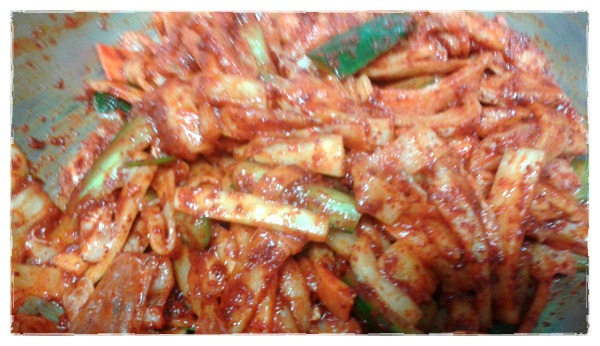 담날 아침밥 준비중에 무와 오이를 넓직하게 썰어 천일염 식초 설탕으로 절여서