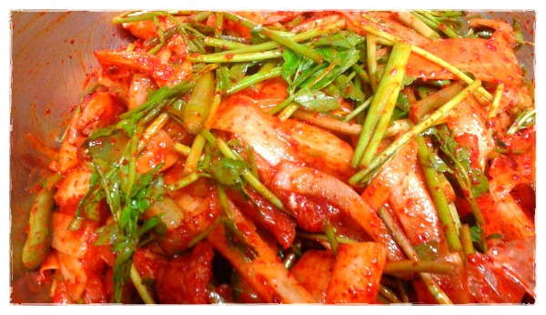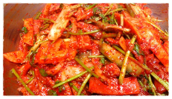 배보자기로 꼭 짜고 고추가루와 마늘고추장으로 색을 내기위해 버물버물