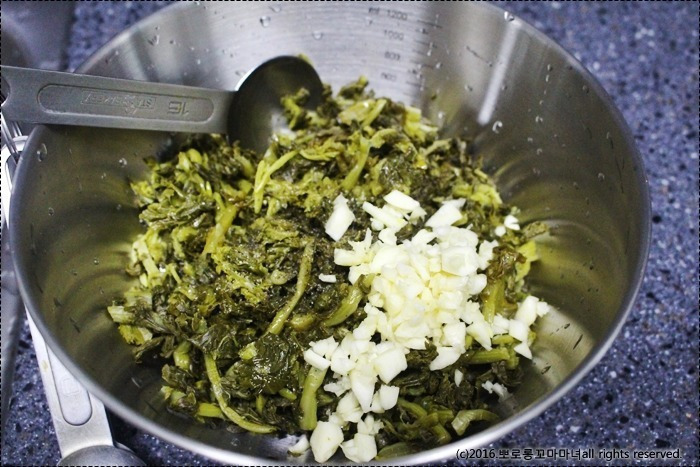 깨끗하게 씻은 뒤에 물기 꼬옥 짜내서 쫑쫑 작게 썰어줍니다.