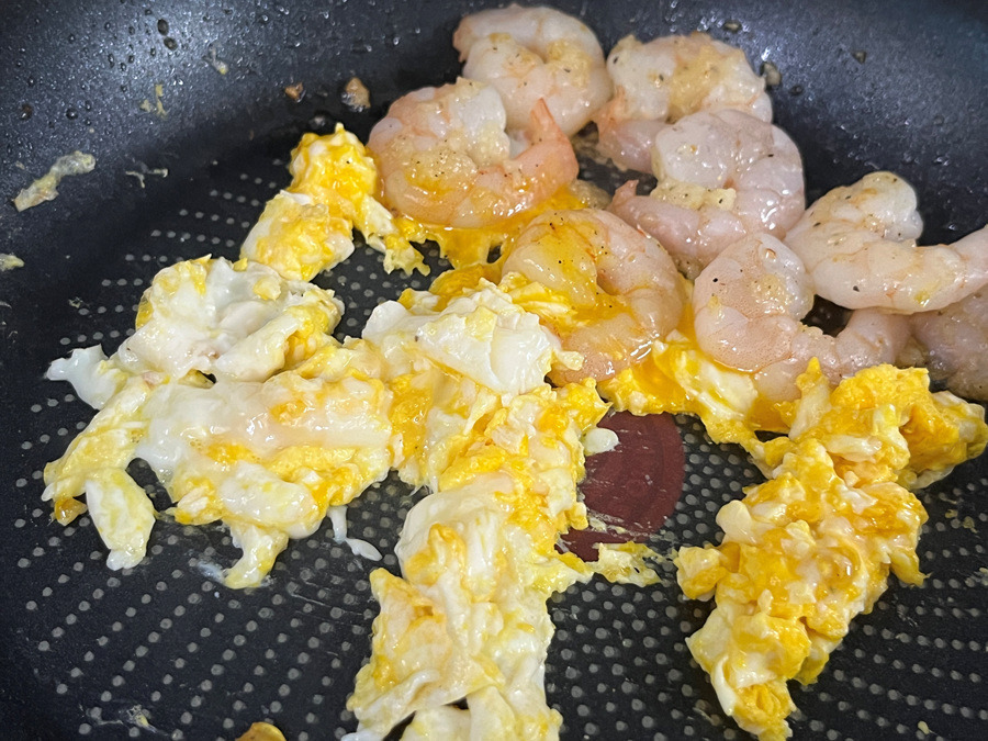 계란은 오래 볶으면 식감이 단단해지기 때문에 새우가 다 익어갈 때쯤 넣고 익히세요.