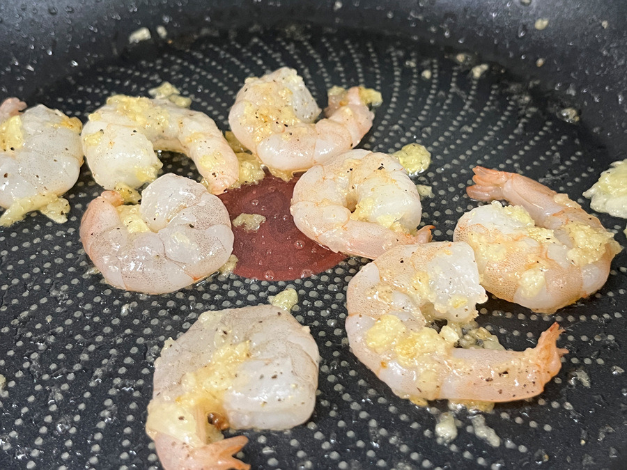 마늘이 노릇하게 익으면서 향이 올라오면 새우를 넣고 함께 볶습니다.