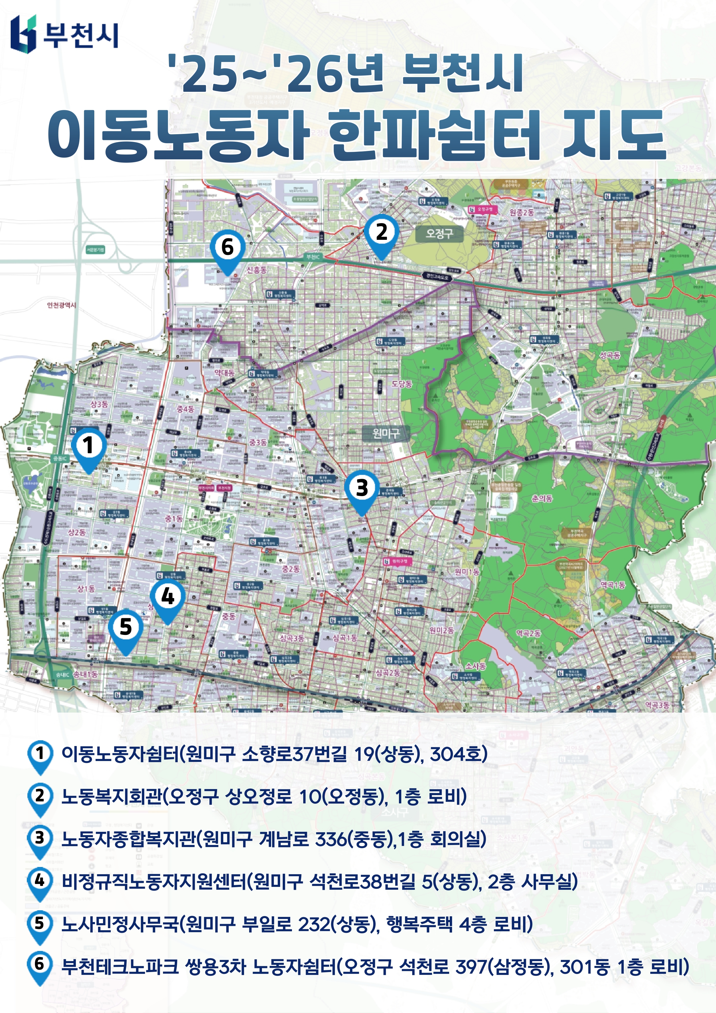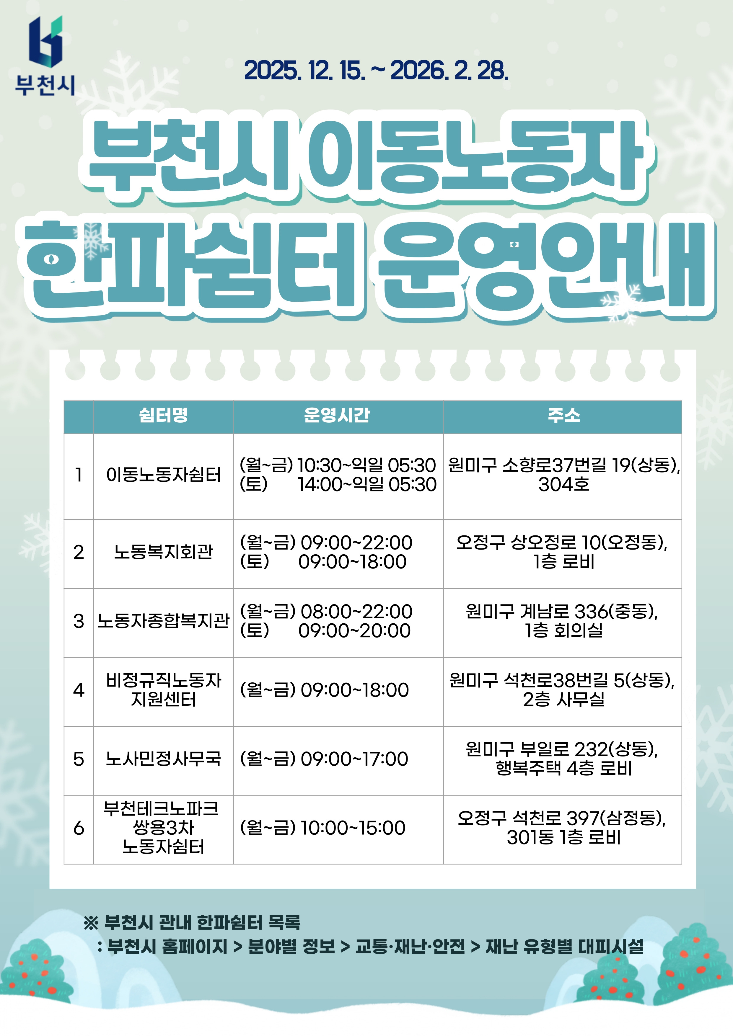 2025년 12월 15일(월) ~ 2월 28일(토)까지 운영되는 부천시 이동노동자 한파쉼터를 안내해 드립니다. 부천시이동노동자쉼터를 포함한 총 6개소 한파쉼터의 위치와 이용 가능 시간을 아래의 포스터를 통해 안내해 드립니다.