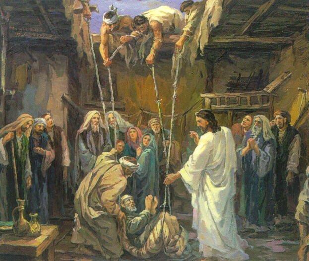 예수께서 계신 곳의 지붕을 뚫어 구멍을 내고 중풍병자를 상에 눕힌 채 달아내리니