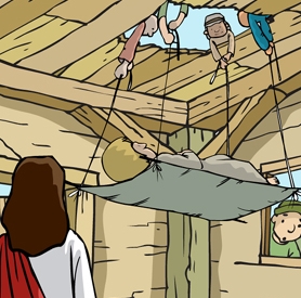 1) 네 사람이 지붕을 뚫고 중풍병자를 상에 뉘어 달아 내려놓으니(4절)