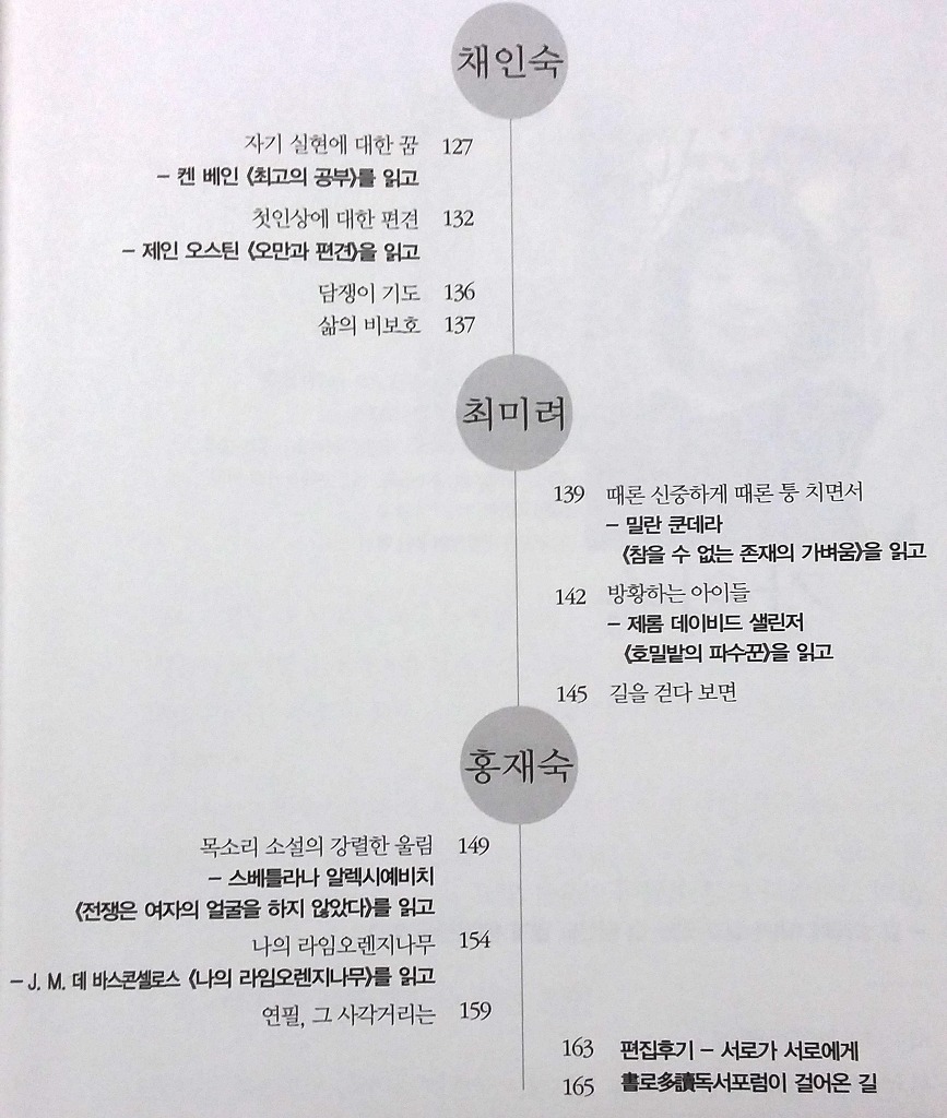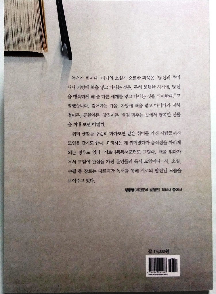 독서토론의 모임을 갖게 된 것은 차윤옥 좌장님의 아이디어가 있어 가능했다. 2012년 4월에 발족한 모임이다. 명작을 읽고 함께 토론을 하고 나면, 책에 대한 이해와 기억이 훨씬 오래 남는다. 곁에서 힘을 보태주신 정종명 선생님의 격려도 잊을 수 없다. 2013년 12월에 ≪문인의 꿈 독서의 힘1≫을 냈고, 2014년 12월에 ≪문인의 꿈 독서의 힘2≫을 냈고, 2016년 12월에 ≪독서가 힘이다≫를 낸다.