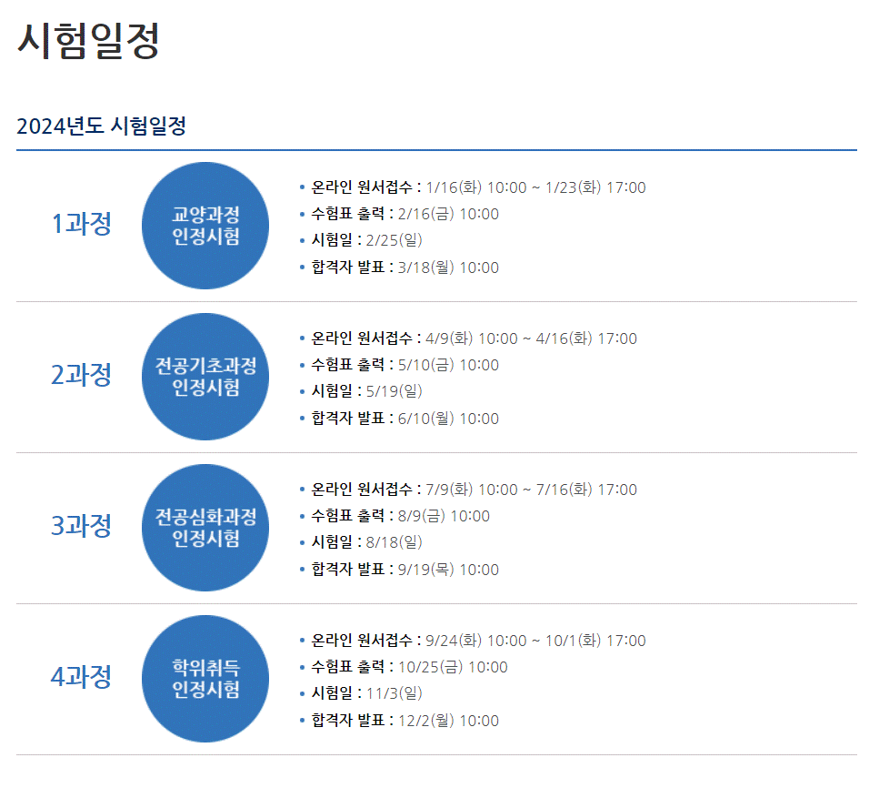 24년독학사 시험일정 작성자♡진이샘♡|작성시간24.01.04|조회수347 목록 댓글 0 글자크기 작게가 글자크기 크게가 독학학위제 홈페이지 (nile.or.kr) 독학학위제 홈페이지bdes.nile.or.kr 단계별 시험과목 전공분야/과목>시험안내>국가평생교육진흥원 독학학위제 (nile.or.kr) 전공분야/과목>시험안내>국가평생교육진흥원 독학학위제HOME 시험안내 전공분야/과목 전공분야/과목 전공분야 독학학위취득시험은 총 11개 전공이 개설되어 있습니다. 국어국문학 영어영문학 심리학 경영학 법학 행정학 유아교육학 가정학 컴퓨터공학bdes.nile.or.kr 다음검색 현재 게시글 추가 기능 열기 북마크 공유하기 신고 센터로 신고 댓글 댓글 0 댓글쓰기 답글쓰기 댓글 리스트