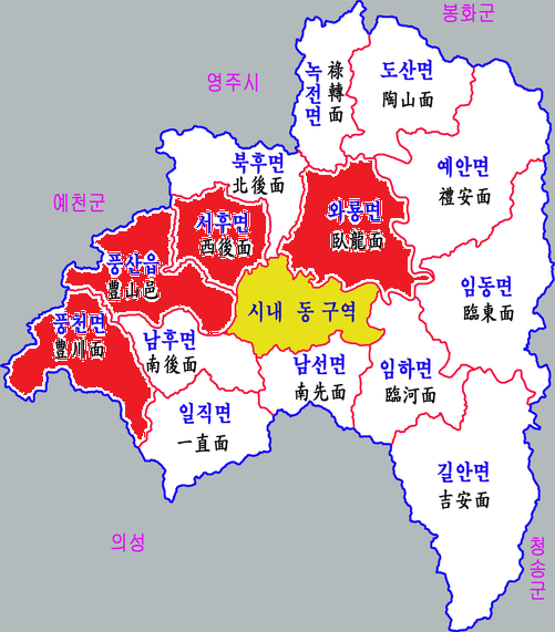 안동도 동쪽은 댐과 높은 산(백두대간), 협소한 발전공간으로 도시형성의 동력이 떨어지고 있으며 더구나 댐으로 인하여 지역이 물에 잠겨 교통이 차단되고 생활공간이 줄어들었습니다. 반대로 서쪽은 낮은 산과 평야로 인하여 인구감소가 상대적으로 적었습니다. 또다른 요인은 중앙고속도로 IC, 버스터미널, 신안동역사(예정)가 있어 유동성 유입의 관문이 되어 왔습니다. 더구나 도청신도시가 건설됨으로써 이러한 현상은 더욱 두드러질 것으로 판단됩니다. 와룡면은 안동시와 입접성 때문에 인구가 유지되고 있으며 용상은 뒤에는 산, 앞에는 강으로 막혀있어 공간은 좁으나 아직 개발 여지가 남아 있는 곳입니다. |