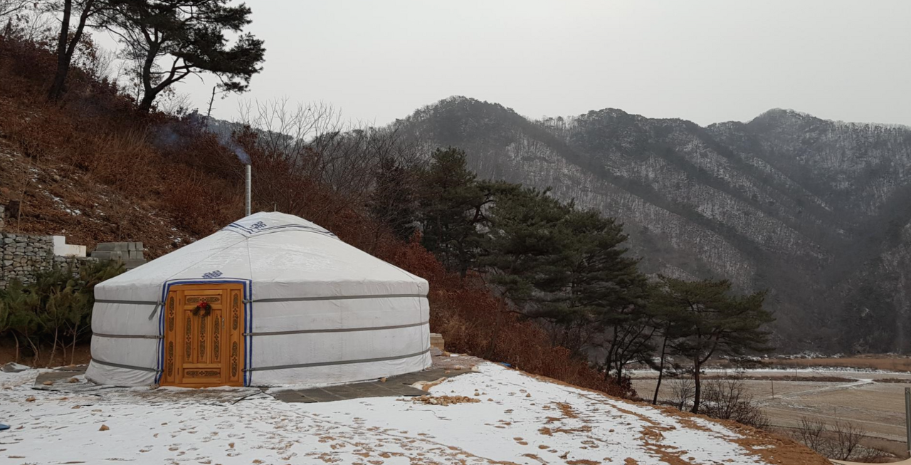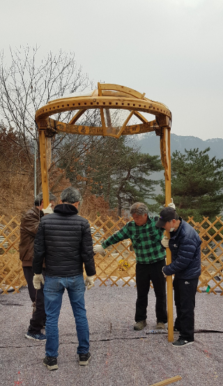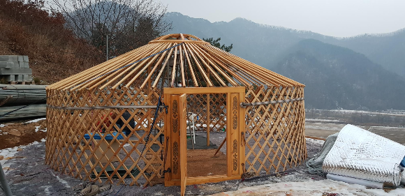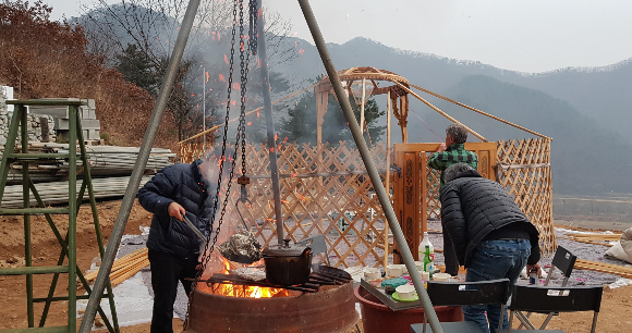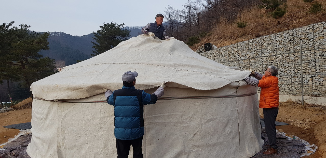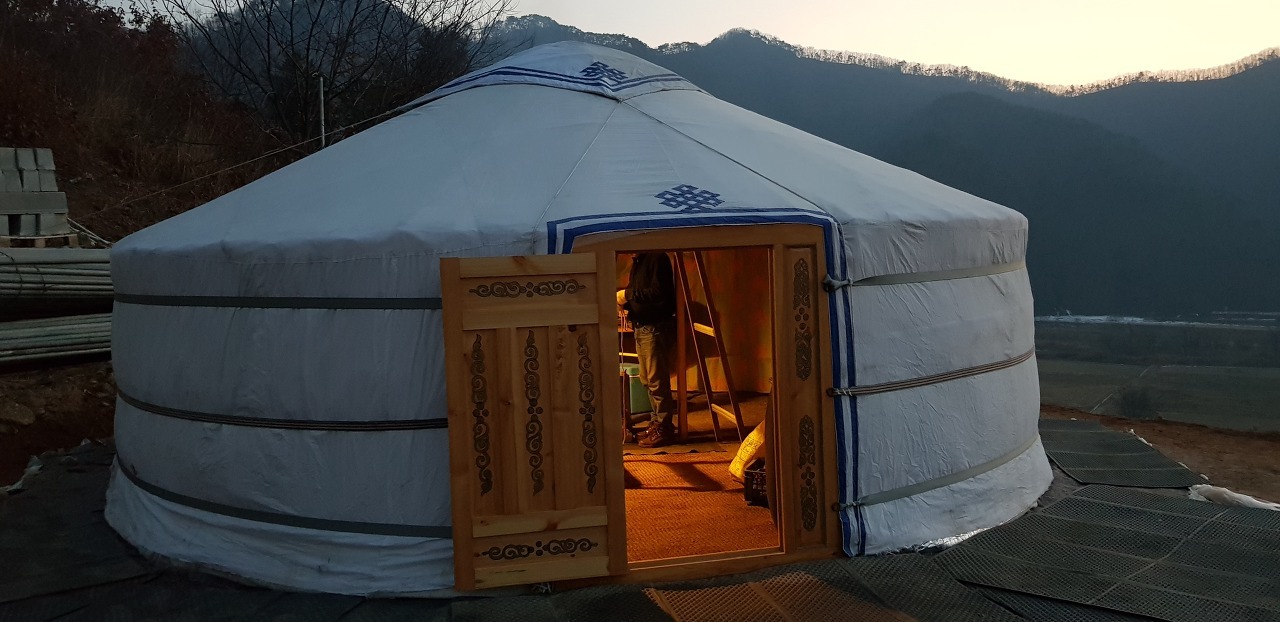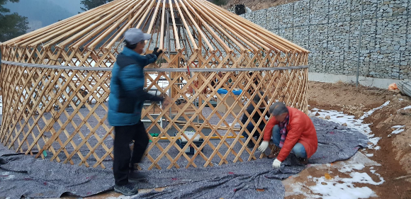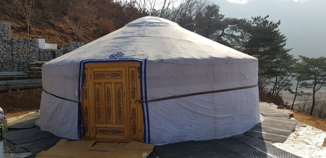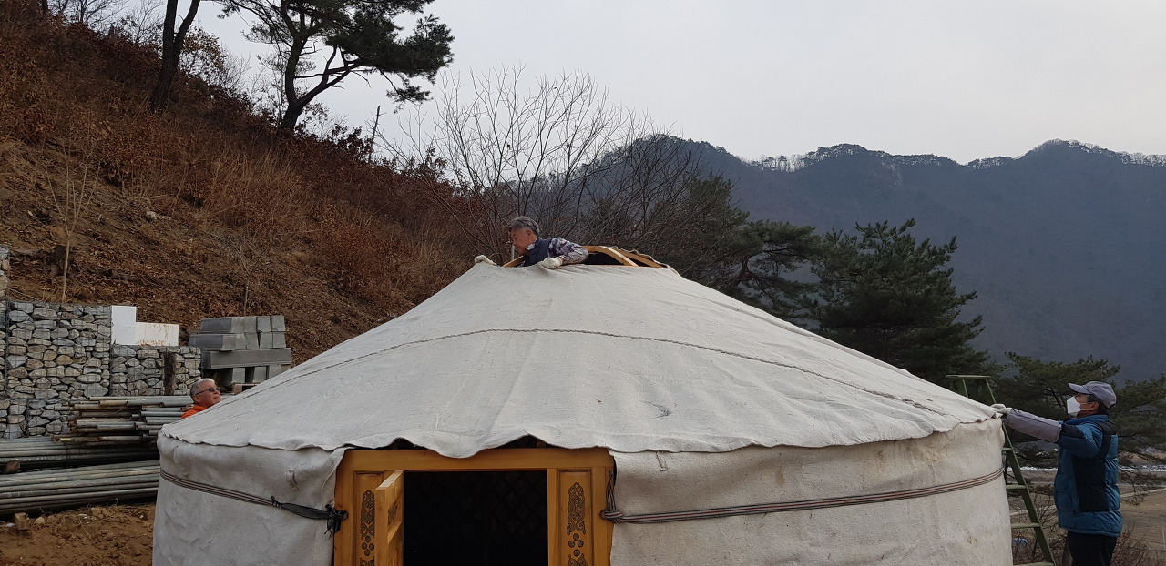 게르는 봄에 공사가 시작 되면 현장 사무실로 사용 되다 마땅한 자리에 옮겨 붙밖이로 공사 후 .