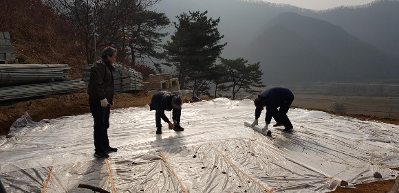 노가다를 해 본 적 없는 펜대들이 게르를 지을 바닥에 비닐을 깔았다.