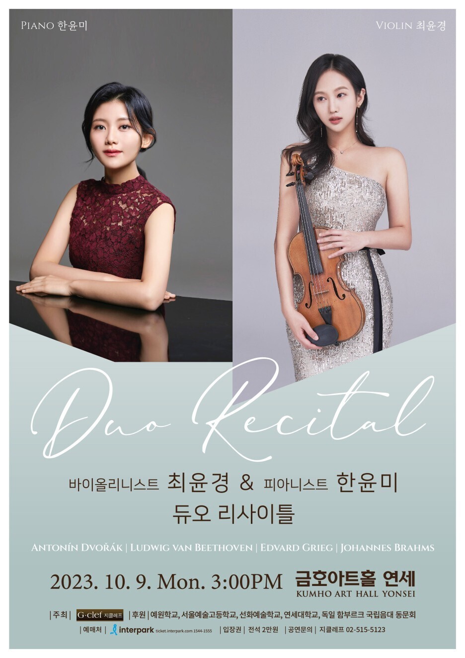 바이올리니스트 최윤경 & 피아니스트 한윤미 듀오 리사이틀 Younkyung Choe & Younmi Han Duo Recital 주최 / 지클레프 후원 / 예원학교, 서울예술고등학교, 선화예술학교, 연세대학교, 독일 함부르크 국립음대 동문회 입장권 / 전석 2만원 티켓예매 / 인터파크티켓 공연문의 / 지클레프 02-515-5123 Profile Violin 최윤경 화려한 테크닉과 깊이있는 소리, 풍부한 음악성을 겸비한 바이올리니스트 최윤경은 서울 예술의전당 영재아카데미를 수료하고 선화예술학교(실기우수상 수상)와 서울예술고등학교(공로상 수상)를 졸업하였으며, 연세대학교 음악대학 관현악과에서 학사학위를 우수한 성적으로 취득하였다. 이후 도독하여 Hochschule für Musik und Theater Hamburg(독일 함부르크 국립음대)에서 석사학위(Master of Music)를 최우수로 취득하였다. 석사과정 중 L. v. Beethoven Violin Sonata No. 8 in G Major, Op. 30 No. 3(베토벤 바이올린 소나타 8번)을 분석한 논문이 출판되어 게재되어있고, R. Strauss Violin Sonata in E flat Major, Op. 18(슈트라우스 바이올린 소나타) 분석 졸업논문을 발표하였으며, Symphoniker Hamburg(함부르크 심포니 오케스트라) 오디션 합격 후 제1바이올린 단원을 역임하였다. 일찍이 한국음악콩쿨 최우수상과 수원청소년오케스트라 협연을 시작으로 국내 여러 오케스트라와 협연한 최윤경은 여러 유수 콩쿨에서 상위 입상하여 연주자로서의 기량을 인정받았다. KCO전국음악콩쿨(구 바로크합주단콩쿨), 음악저널콩쿨, 국민일보한세대콩쿨, 스트라드콩쿨, 음악교육신문사콩쿨, 월간 The Music콩쿨, 부암콩쿨, 서울기독대콩쿨, 예음콩쿨, 한독브람스협회콩쿨 등 다수의 콩쿨에서 1위 및 상위 입상하며 두각을 나타내었고, 독일 International Summerakademie Schloss Heiligenberg 2018 Final Solo Concert 1위를 차지하며 실력을 입증하였다. 최윤경은 유니버설아트센터(구 리틀엔젤스예술회관)에서 실기우수자 독주회 연주, Buam Art Hall 초청 Young Artist Concert에서 2차례의 독주회와 독일 함부르크 St. Johannis Harvestehude, Mendelssohn Saal, Fanny Hensel Saal, Miralles Saal, Forum 등 다양한 무대에서 다수 독주 및 콘서트를 가졌고, 대관령국제음악제, Euroasia Music Festival, International Summerakademie Schloss Heiligenberg 등에 참가 및 연주하여 폭넓은 음악활동을 해 왔다. 솔로연주 뿐만 아니라 오케스트라 및 실내악 연주에도 남다른 관심이 있던 그녀는 독일 Symphoniker Hamburg(함부르크 심포니 오케스트라) 제1바이올린 단원을 역임하였고, 연세대학교 음악대학 재학당시 예술의전당 대학오케스트라축제에서 연세 필하모닉 오케스트라 수석을 역임했으며, 또한 독일 함부르크 국립음대 재학당시 함부르크 국립음대 오케스트라 악장을 역임하며 다양한 레퍼토리의 곡을 접했다. 그리고 세계적인 거장인 Kent Nagano 지휘로 함께 연주하여 큰 호응을 얻었다. 귀국 후 강남심포니오케스트라 제1바이올린 객원단원, 더 클래식 콘서트 아티스트, 오케스트라 디 오리지널 아티스트로써 활동하였으며 오케스트라 뿐만아니라 앙상블, 스트링 콰르텟, 독주회 등 크고 작은 다양한 편성의 연주를 하며 예술의전당 IBK챔버홀, 리사이틀홀, 콘서트홀과 롯데콘서트홀, 세종문화회관, 금호아트홀, 세종 예술의전당, 고양아람누리 등에서 다수 연주활동을 펼치고 있다. 또한 이미경, 김민, 이경선, 조영미, 김의명, Tanja Becker-Bender, Jacek Klimkiewicz, Koh Gabriel Kameda, Mincho Minchev, Andreas Roehn 등 국내외 유명 교수님들의 Master Class에 참가하여 꾸준히 음악적인 역량을 쌓았다. 국내에서 김의명, 조영미 교수를, 국외에서 Prof. Andreas Roehn을 사사한 바이올리니스트 최윤경은 2022년 12월 예술의전당 리사이틀홀 귀국 바이올린 독주회를 가졌으며, 학생들을 여러콩쿨에서 입상시키며 출강 및 후학양성에도 힘쓰고 있다. 현재 김의명 교수의 JK챔버오케스트라와 트리오 루체레 멤버로 활동하며 다양한 무대를 통해 깊이 있는 연주자로서 행보를 이어나가고 있다. Piano 한윤미 감각적인 터치와 섬세한 음악적 표현력을 가진 피아니스트 한윤미는 예술의전당 영재아카데미를 수료하고 예원학교, 서울예술고등학교를 졸업하였으며, 연세대학교 음악대학 피아노과를 우수한 성적으로 졸업하였다. 일찍이 영산음악콩쿠르, KCO전국음악콩쿠르(구 바로크합주단콩쿠르), CBS전국청소년 음악콩쿠르, 음악세계 전국결선, 전국음악콩쿠르, 체르니콩쿠르, 충청남도 교육감배 음악경진대회 등 상위 입상하여 두각을 나타내었고, 이외에도 International College of Arts 2위, 한국 피아노듀오콩쿠르 특상(강운경상), 한음음악콩쿠르 피아노듀오 부문 전체우수상 등 다수의 콩쿠르에서 석권하며 자신의 실력을 입증하였다. 또한, 구리시교향악단 협연으로 청중들의 극찬을 받은 바 있는 그녀는 France Tignes Music alp Festival, Indiana University Jacobs School of Music Summer Music Festival, Bayerische Musikakademie Hammelburg Music Festival, 서울대학교 음악대학 국제 피아노 아카데미 등 다양한 음악 페스티벌에 참가하여 학구적인 면모도 보여주었다. 솔리스트로서 뿐만 아니라 실내악 연주자로서 대전 예술의전당, 연세대학교 백주년기념관, 마포아트센터, 과천시민회관 등 다수 연주를 통해 빈틈없는 행보를 거듭