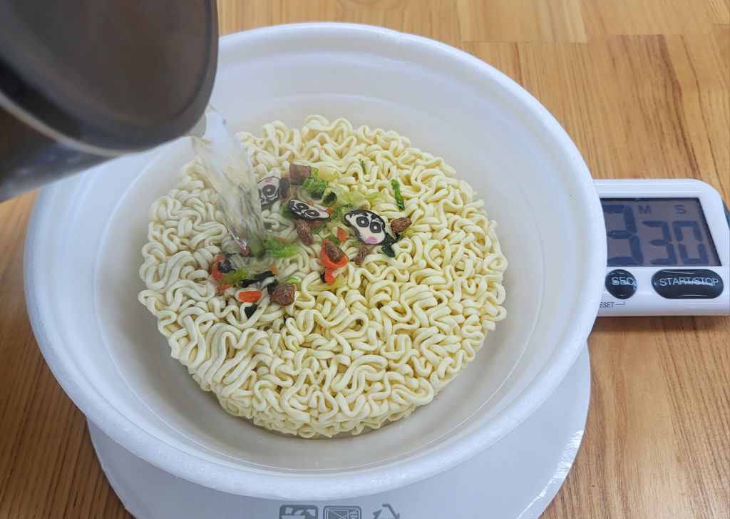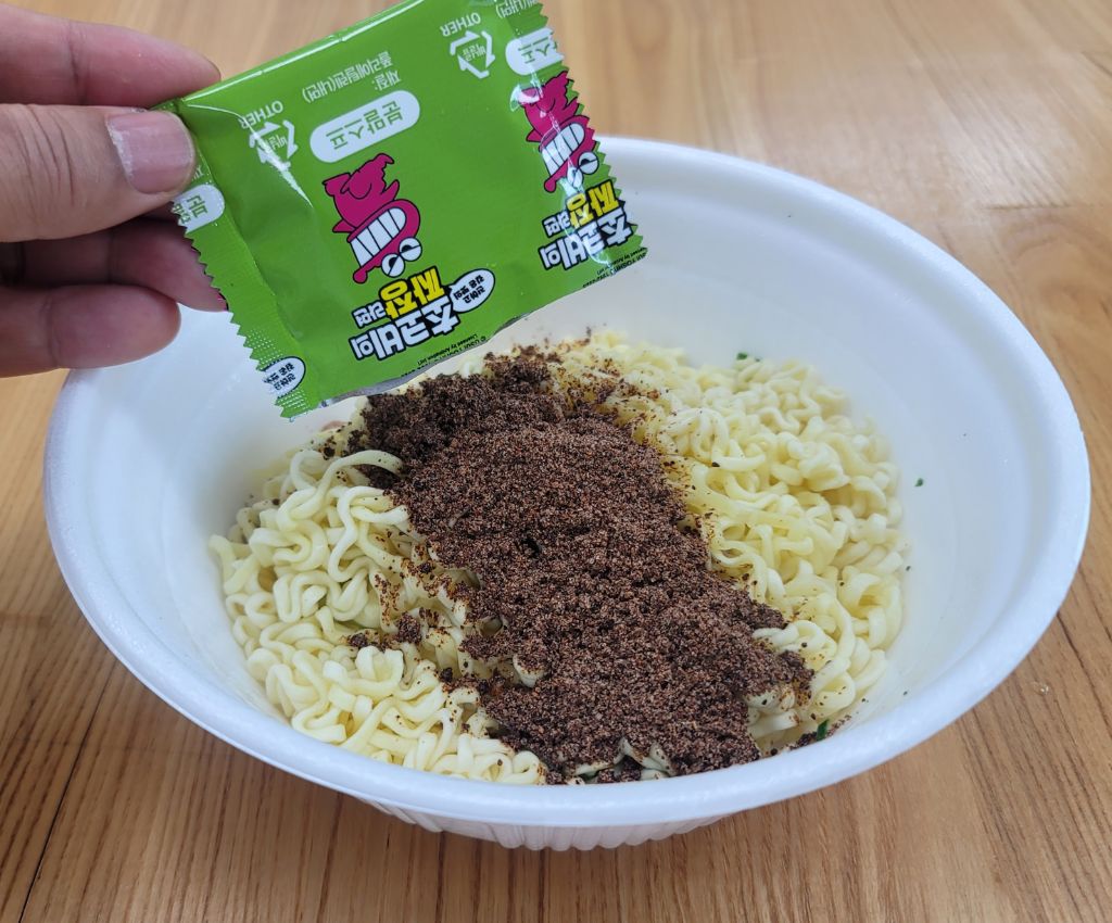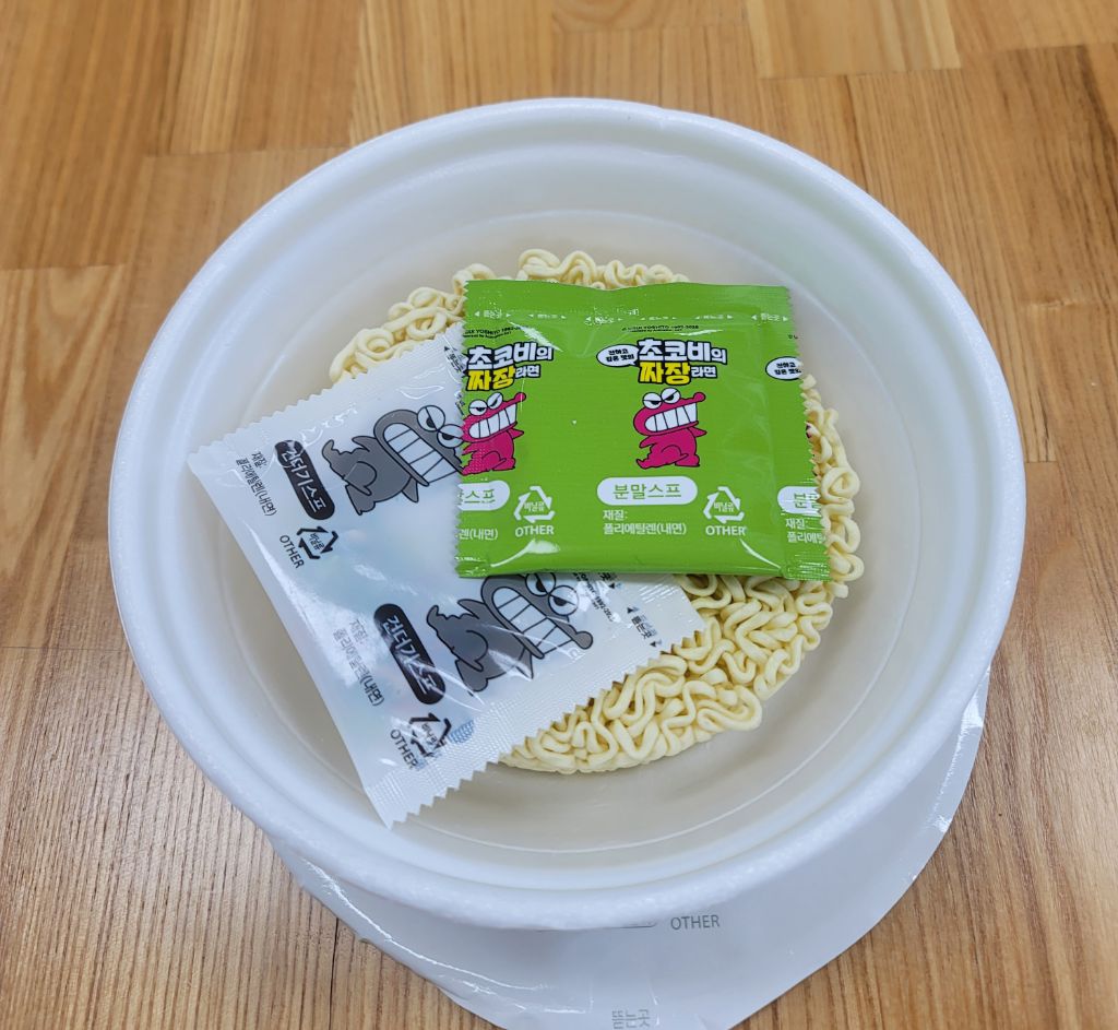 조리법은 면위에 건더기스프를 넣고 끓는 물을 용기안쪽표이선까지 부은후 3분30초간 조리후 물을 따라버리고