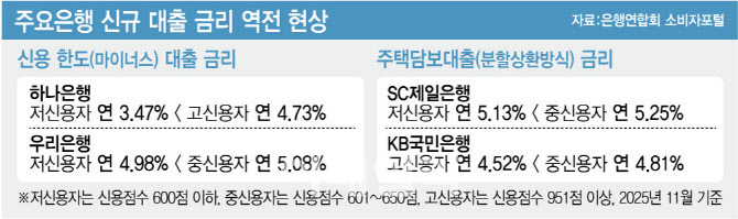 은행 대출 시장에서 ‘신용이 높을수록 금리가 낮다’는 공식이 흔들리고 있다. 은행연합회 소비자포털에 따르면 최근 고신용자보다 저신용자에게 더 낮은 금리를 적용하거나, 저신용 구간에서 신용점수가 더 낮은 이들에게 더 낮은 금리를 제공한 ‘금리 역전’ 현상이 갈수록 확산하고 있다. 은행들이 대출 총량 규제에 대출 문턱을 높이는 가운데 포용 금융 기조에 따라 저신용자에게 금리 혜택을 늘린 결과로 해석된다.