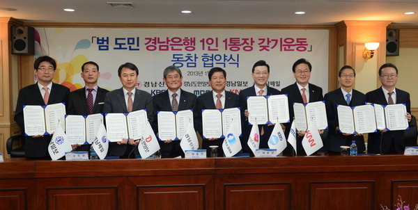 2013년 1월 당시 경남은행 분리매각이 추진되는 과정에서 지역에서는 범도민 경남은행 1인 1통장 갖기 운동이 일어났다. 사진은 경남지역 언론기관이 동참 협약식을 연 모습이다. /경남도민일보DB