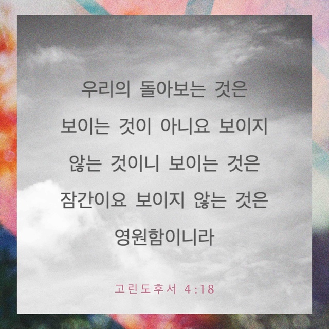 우리의 돌아보는 것은 보이는 것이 아니요 보이지 않는 것이니 보이는 것은 잠간이요 보이지 않는 것은 영원함이니라