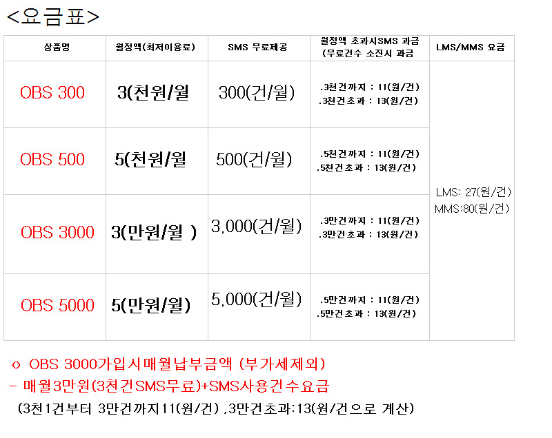 - obs 기존 요금제 해지 후 3개월 이내 베이직 300/500/3000/5000 재 가입 불가