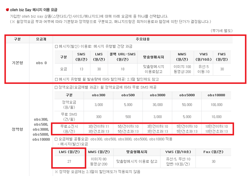 - 정액제 요금(매월기본료내시고 sms무료혜택받음)
