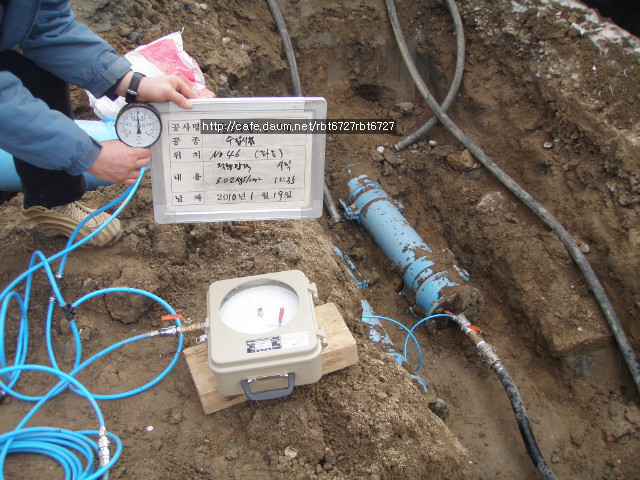 그래서 물 은 누수탐지 목적(누수되는부분에 물 비침)으로만 관로에 물을 채우고 압은 공기압으로 체크한다.