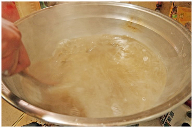 이때 엿기름을 바락바락 주물러 윗물만 따라낸 물이 3.2리터가 나와야 합니다.