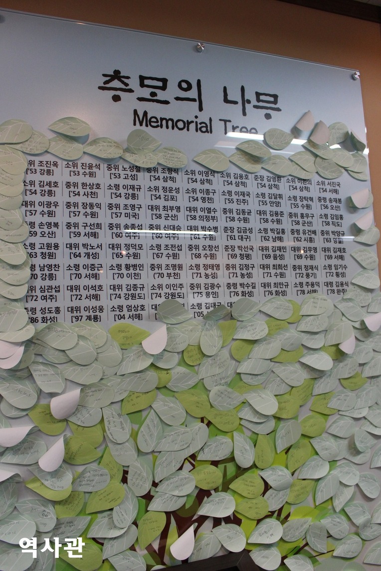 역사관의 추모의 나무는 6.25 전쟁 당시 조국을 지키다 목숨을 잃은 조종사들을 위해 추모를 할 수 있는 공간으로, 2014년까지 순직한 조종사는 총 378명이며 이중 10전비 소속이었던 조종사는 69명이라고 합니다. 시민들이 직접 추모의 나무에 글을 쓴 흔적을 보니, 앞으로도 그들을 기억해야겠다는 생각이 들었습니다.