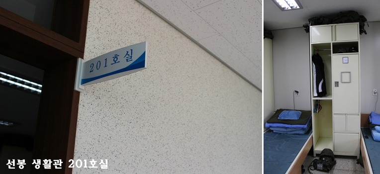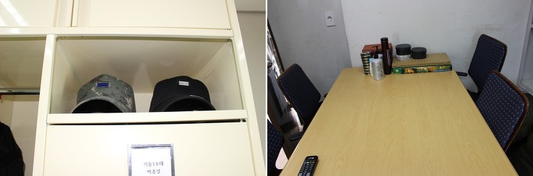 헌병대대 선봉 생활관 201호실에 들어가보았습니다. 각 내무실 마다 일곱 명이 함께 생활을 하는데, 깔끔하게 정리되어 있는 모습이 눈길을 끌었습니다. 개인 관물함에는 전투복, PE복, 체련복 등을 보관하고 나머지 공간에는 개인 용품 보관도 가능하다고 합니다.