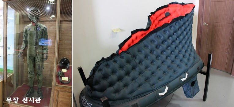 또한 무장 전시관에는 조종사의 옷부터 조종사에게 필요한 물품들도 전시되어 있었습니다. 그 중에서 구명정(오른쪽)은 조종사가 비상 탈출 후 수면에 착륙하여 구조될 때까지 부력을 제공한다고 합니다.