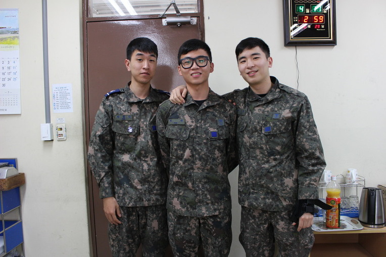다음으로 간 곳은 헌병대대 행정계로, 남자친구가 일하는 사무실이었습니다. 박상신 으뜸병사(좌), 박수 병장(가운데, 남자친구), 최민식 병장(우)는 막역한 사이로 군 생활에서 서로를 의지하면서 지내는 사이입니다. 으뜸병사는 제 10전투 비행단에 총 2명이 있는데, 그 중 한 명인 박상신 으뜸병사를 인터뷰 하였습니다. 박상신 으뜸병사는 모든 병사를 대표하여 병사의 의견을 주임원사에게 전달하고, 병사들이 서로 잘 어우러지도록 중간에서 도와주는 역할을 한다고 합니다.