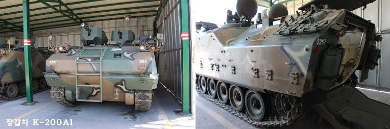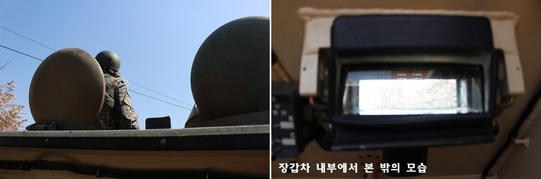 먼저, 10전비 정훈공보실 이수희 중위의 인솔 하에 장갑차를 탑승하는 기회를 가졌습니다. 제가 탄 장갑차의 기종은 K-200A1 으로 작전 지역 출동에 화력 지원, 강제 착륙시도 항공기 저지, 기지 내 무장 순찰 등의 임무를 맡고 있습니다.