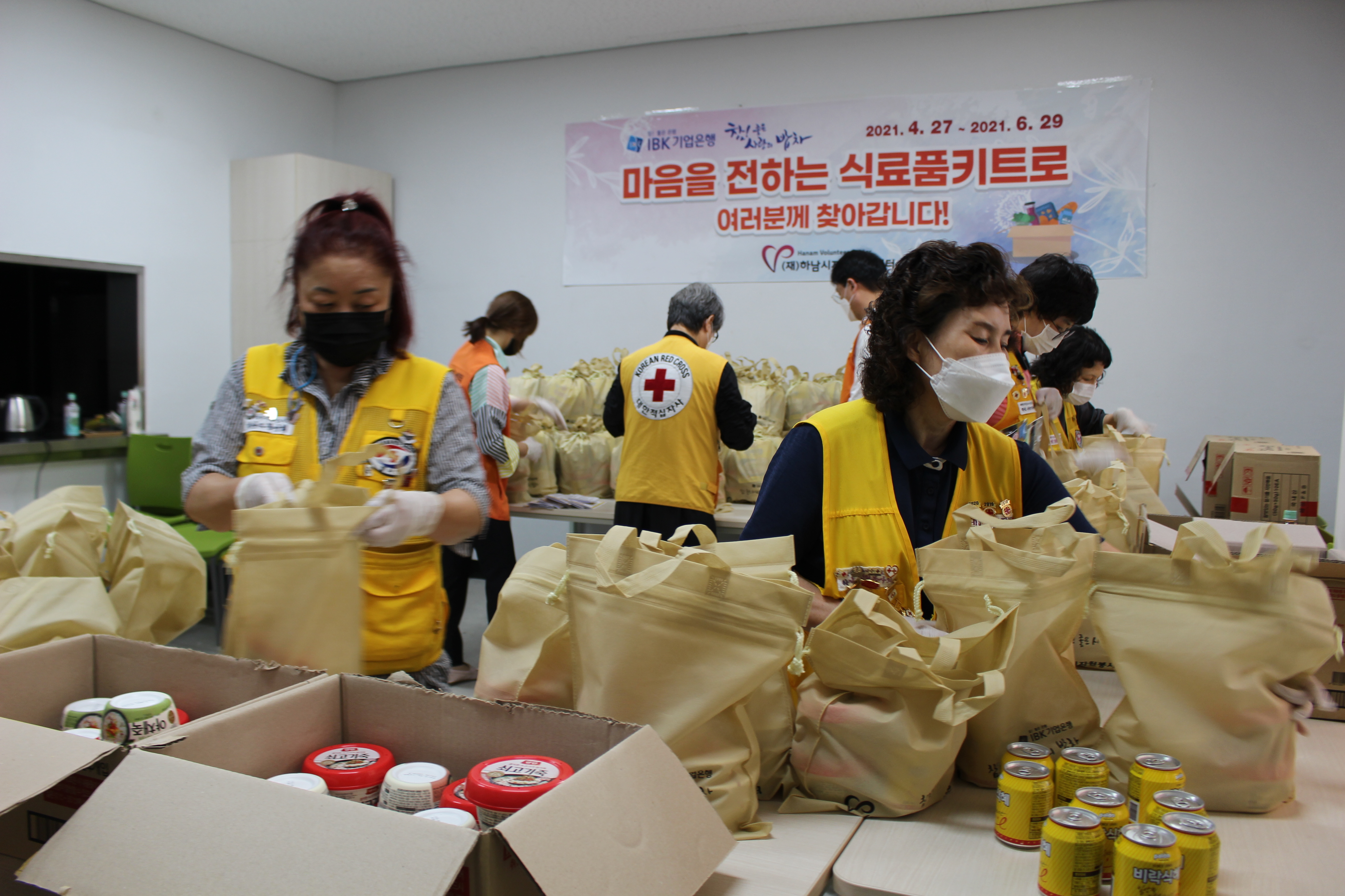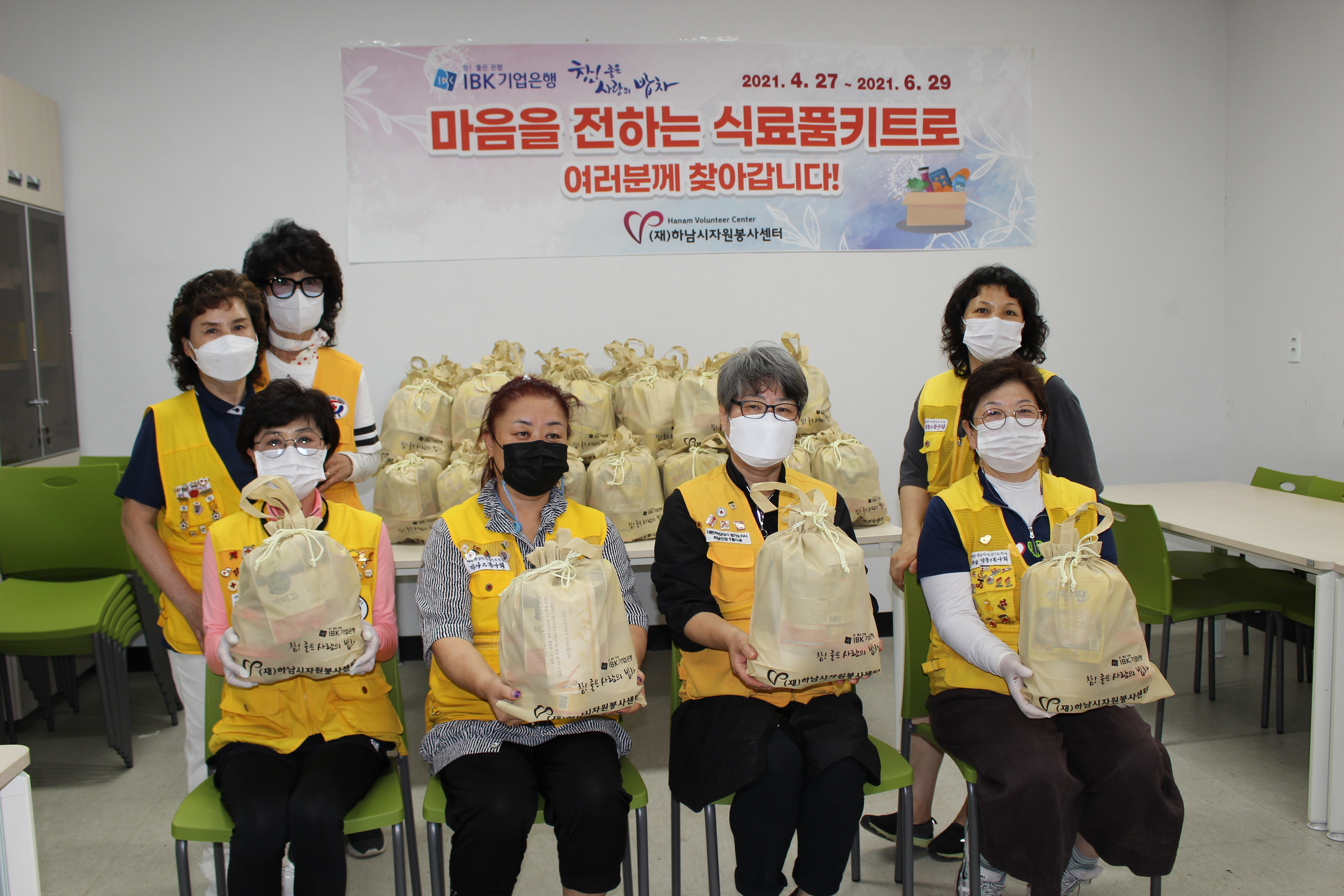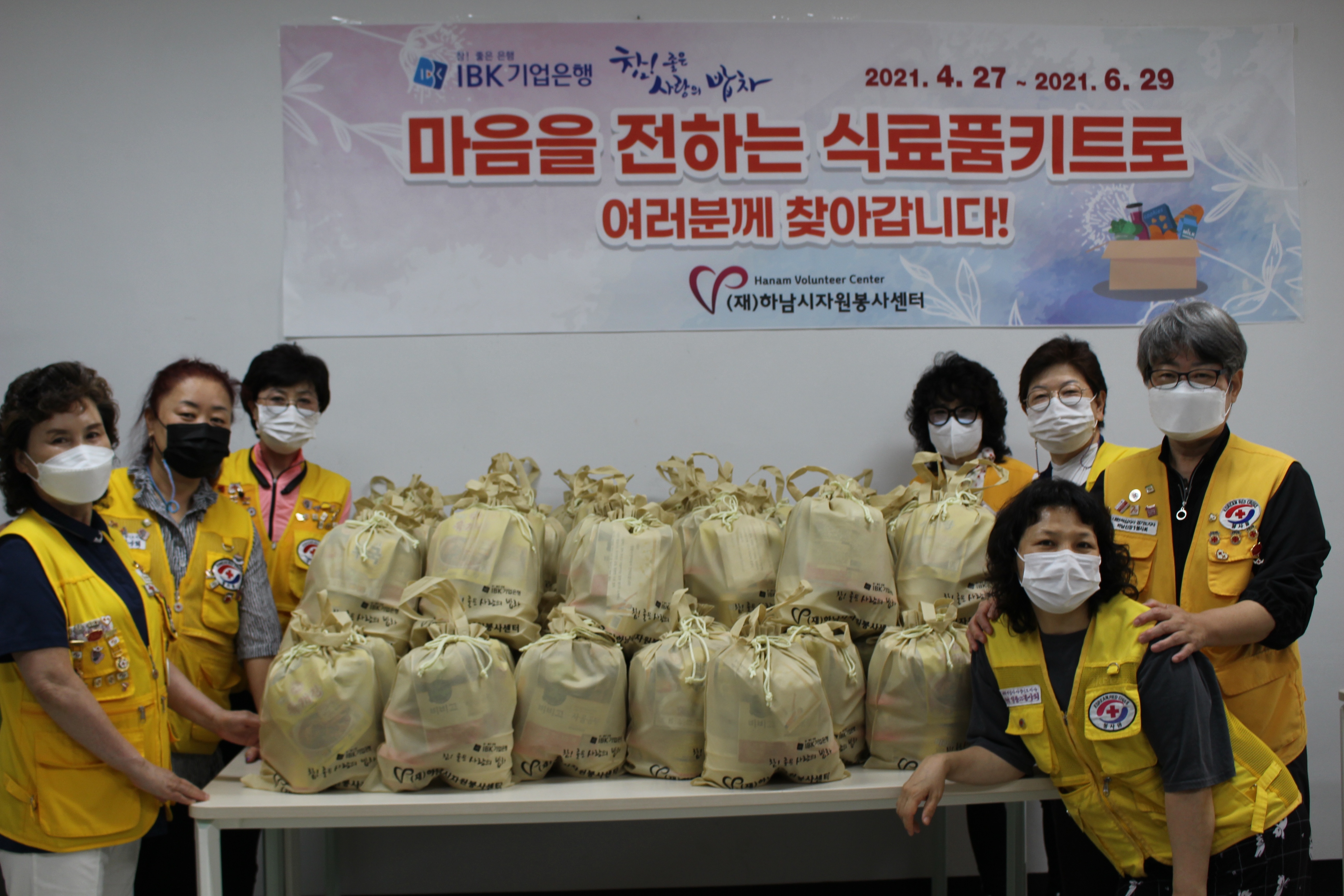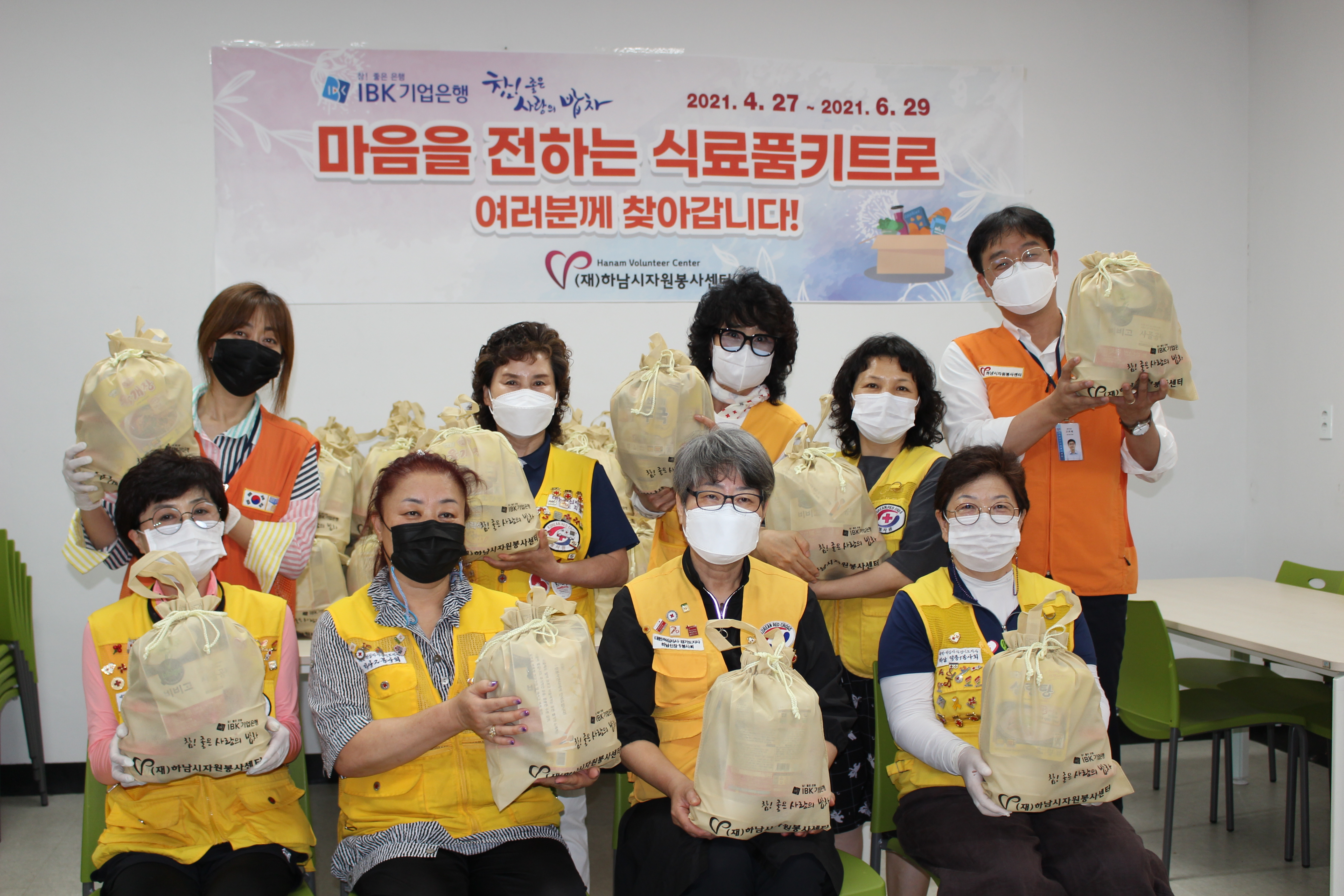 6월 29일 (화) 하남시 자원봉사센터는 IBK기업은행 후원으로 참! 좋은 사랑의 밥차 따뜻한 한 끼 식사 나눔을 몇 년째 운영을 해왔다. 코로나로 인하여 기존의 무료 급식이 어려운 상황이다. 이로 인하여 식사 준비에 조금이나마 도움이 되고자 마음을 전하는 식료품 키트를 봉사회 단체 봉사원이 제작하여 2021년 4월 27일 ~6월 29일까지 취약계층을 방문하여 전달했다.