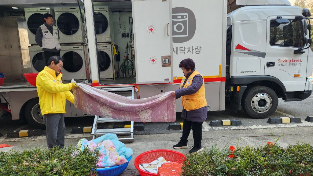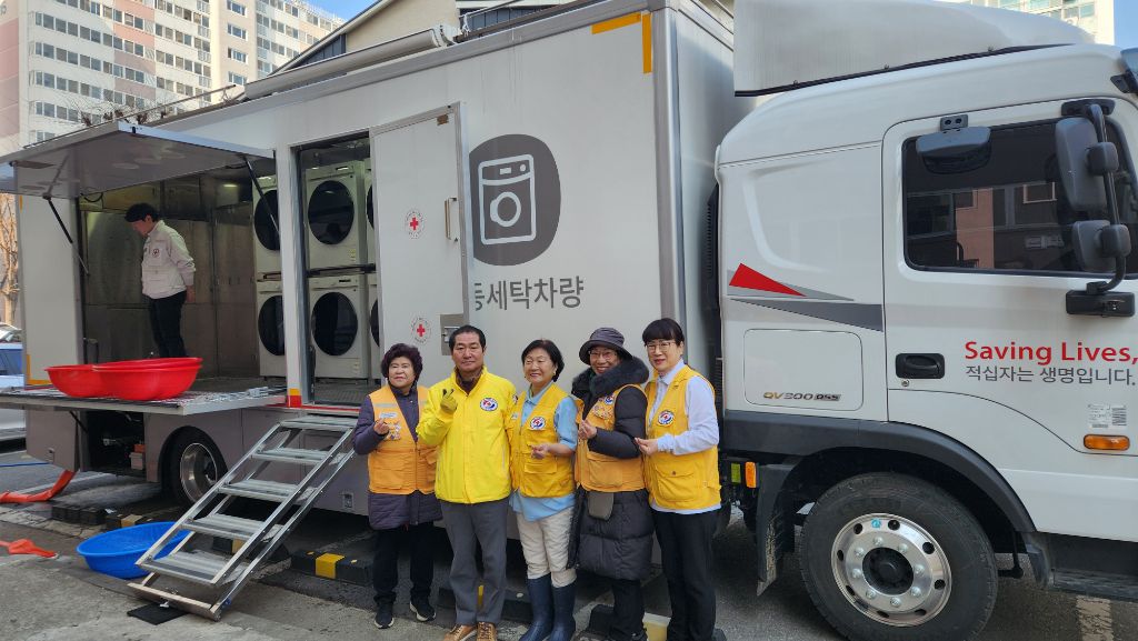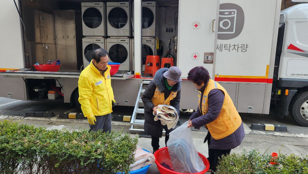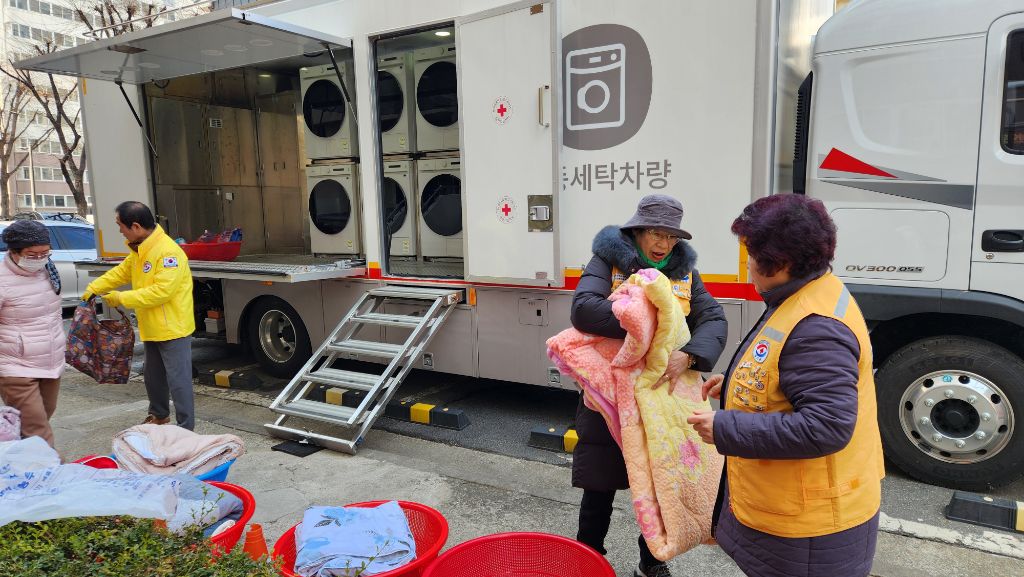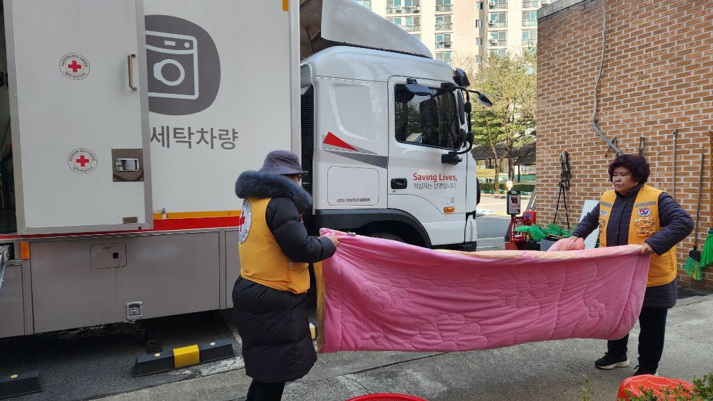 대한적십자사 경기도지사 산본1동봉사회 (회장 이숙자)는 지난 12일 (목) 주몽아파트 관리소 앞마당에서 봉사원들과 함께 이동세탁차량을 이용한 세탁 봉사를 진행했다.